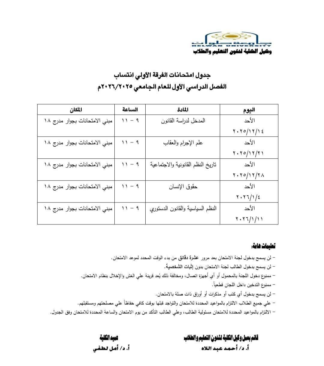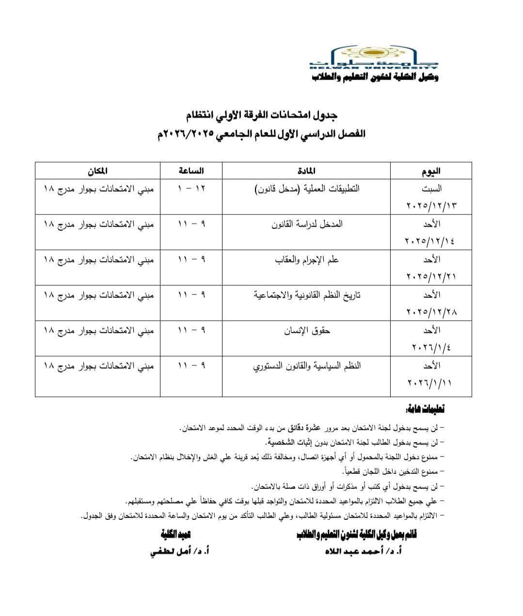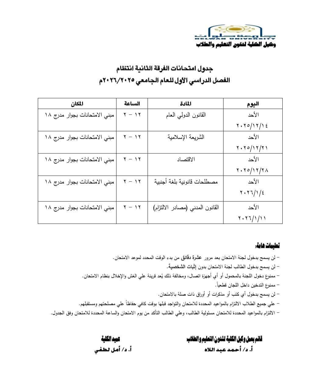 أعلنت كلية الحقوق جامعة حلوان، جداول ومواعيد امتحانات نصف العام الدراسي 2025/2026 لجميع الفرق بنظامي الانتساب والانتظام.
