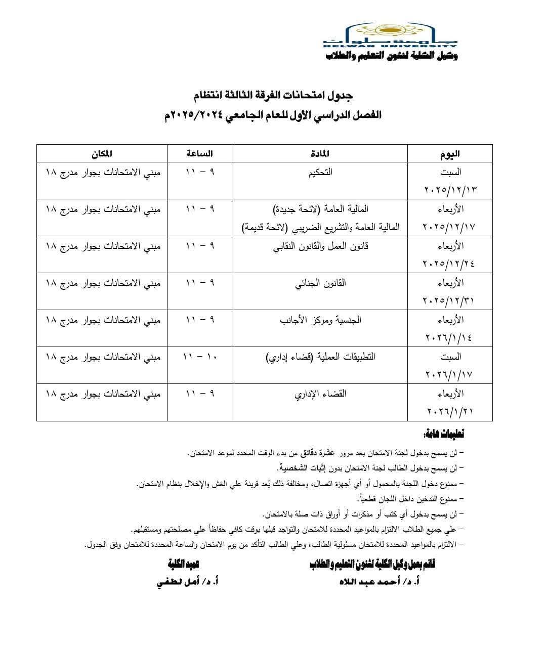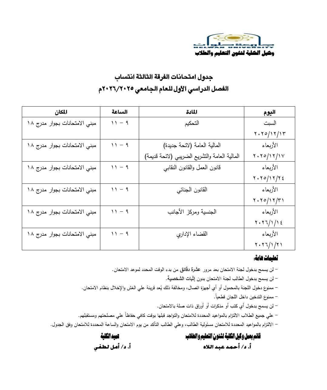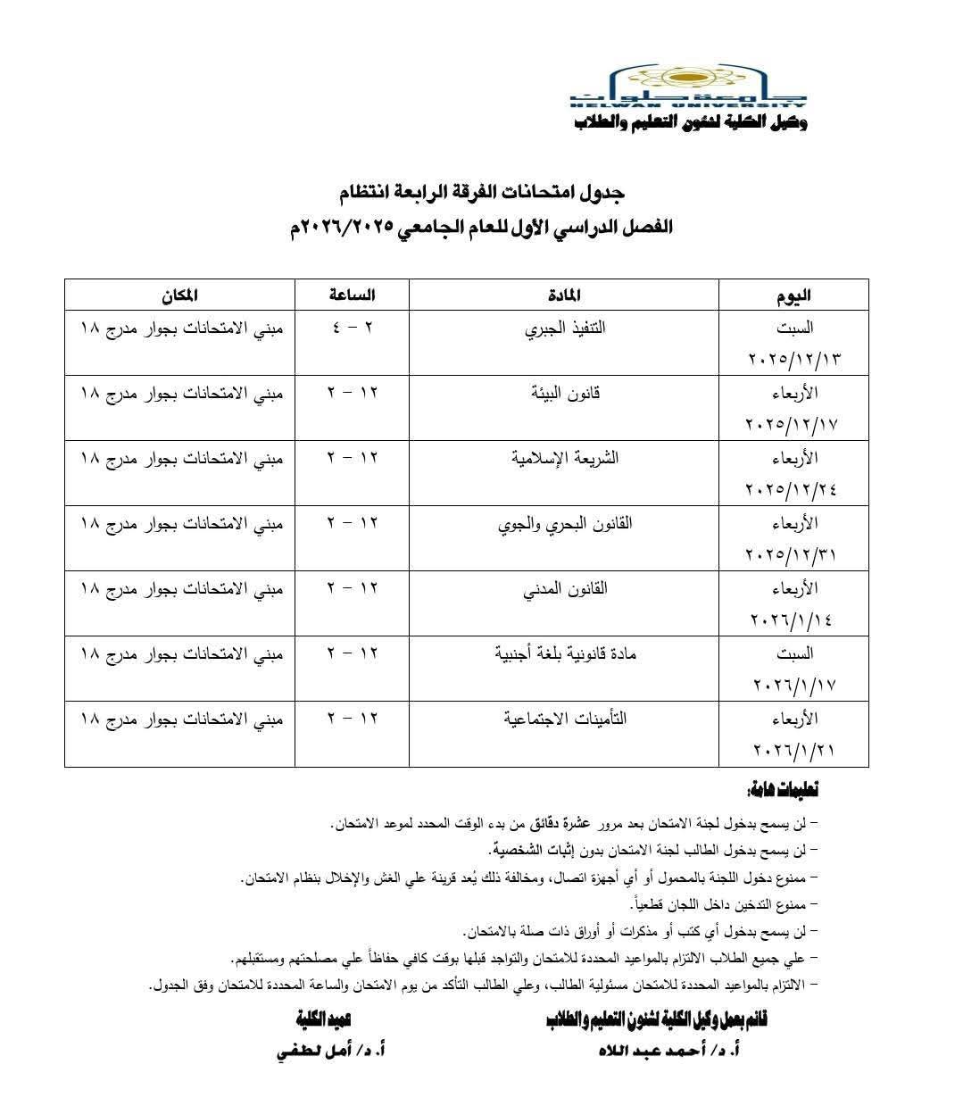 أعلنت كلية الحقوق جامعة حلوان، جداول ومواعيد امتحانات نصف العام الدراسي 2025/2026 لجميع الفرق بنظامي الانتساب والانتظام.