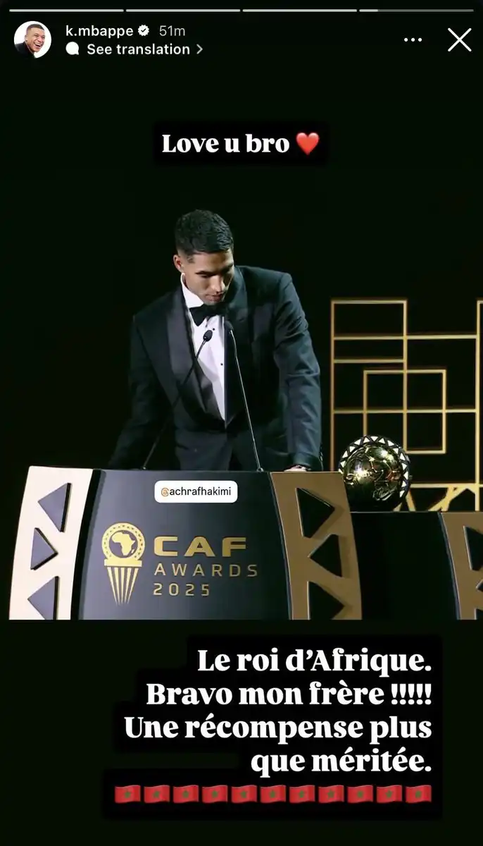 وأرفق مبابي الصورة بتعليق قال فيه: "أحبك يا أخي... ملك إفريقيا. أحسنت، هذه جائزة أكثر من مستحقة".