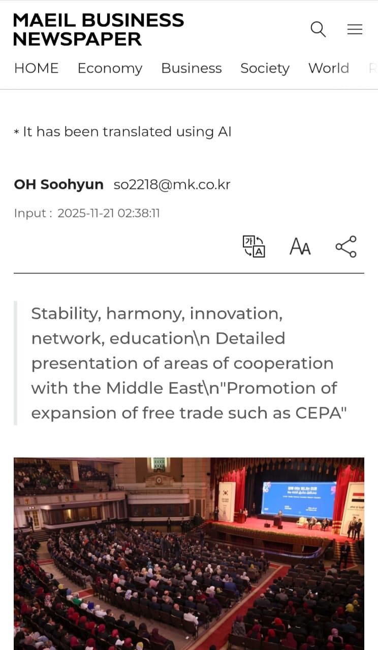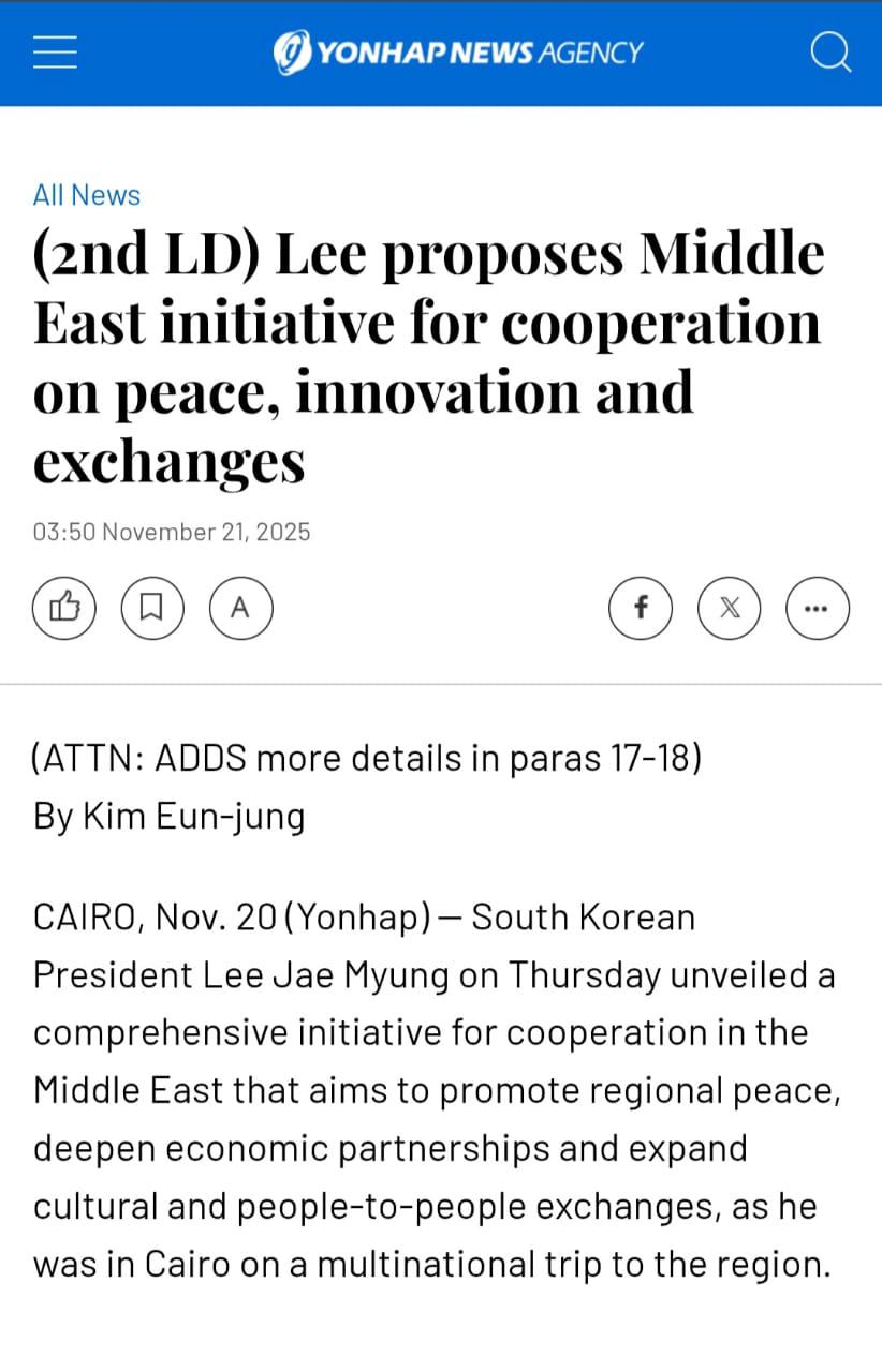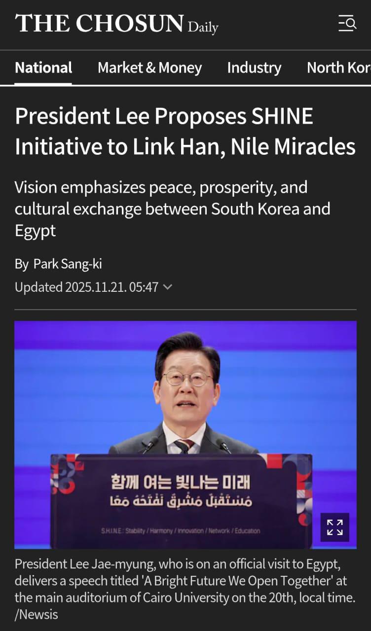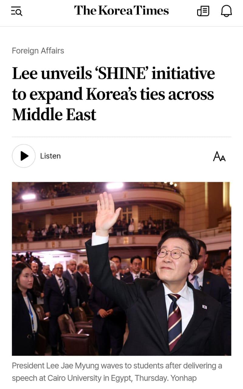 كما تناولت صحيفة The Korea Times تدشين مبادرة SHINE باعتبارها خطوة استراتيجية لتوسيع الشراكات الكورية في الشرق الأوسط، ونشرت صورة للرئيس الكوري وهو يبادل طلاب جامعة القاهرة التحية عقب خطابه التاريخي بقاعة الاحتفالات الكبرى، في مشهد عكس عمق التفاعل الإنساني والثقافي بين الجانبين.