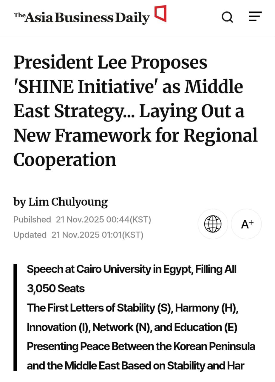فقد أشارت صحيفة The Asia Business Daily إلى أن قاعة الاحتفالات الكبرى بجامعة القاهرة امتلأت عن آخرها بـ3050 مقعدًا في استقبال الرئيس الكوري، الذي أعلن من تحت قبة الجامعة إطلاق مبادرة تحمل اسم SHINE، تهدف إلى تعزيز رؤية تعاون مشترك بين شبه الجزيرة الكورية والشرق الأوسط تحت شعار السلام والازدهار والتبادل الثقافي، موضحة أن حروف المبادرة ترمز إلى: الاستقرار، والانسجام، والابتكار، وبناء الشبكات، والتعليم، بما يعكس إطارًا استراتيجيًا متكاملًا للتعاون المستقبلي.