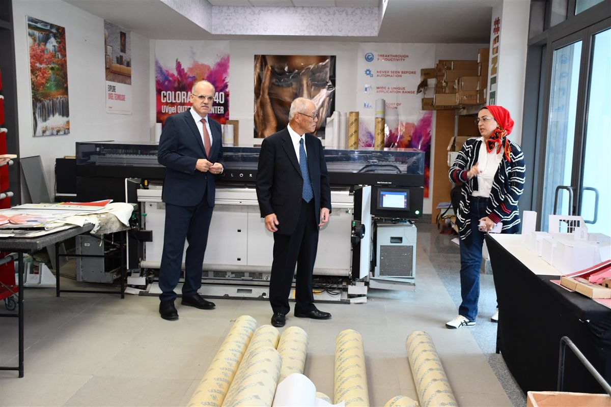 وعقب انتهاء المحادثات الثنائية، قام السفير إيواي بجولة تفقدية داخل المركز المتكامل لخدمات الطباعة المقام بالجامعة بالتعاون مع شركة كانون اليابانية برفقة الدكتور ياسر حجازي، رئيس الجامعة.