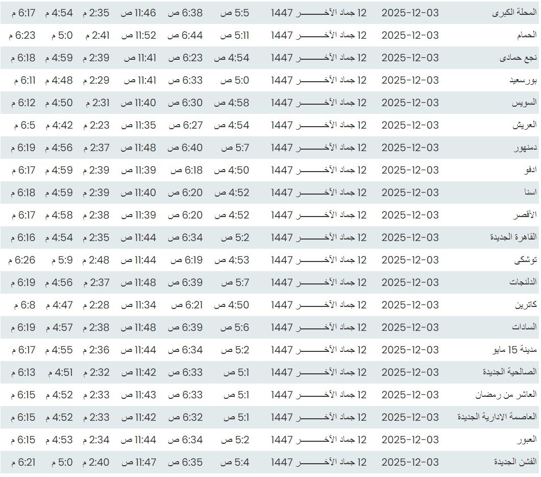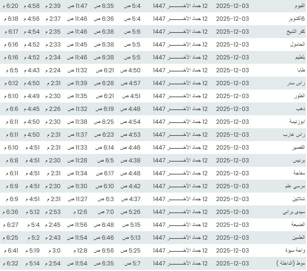 مواقيت الصلاة اليوم وفقًا للتوقيت المحلي لمدينتي القاهرة والإسكندرية وكذلك لعدد من مدن ومحافظات الجمهورية من واقع بيانات الهيئة العامة للمساحة:
