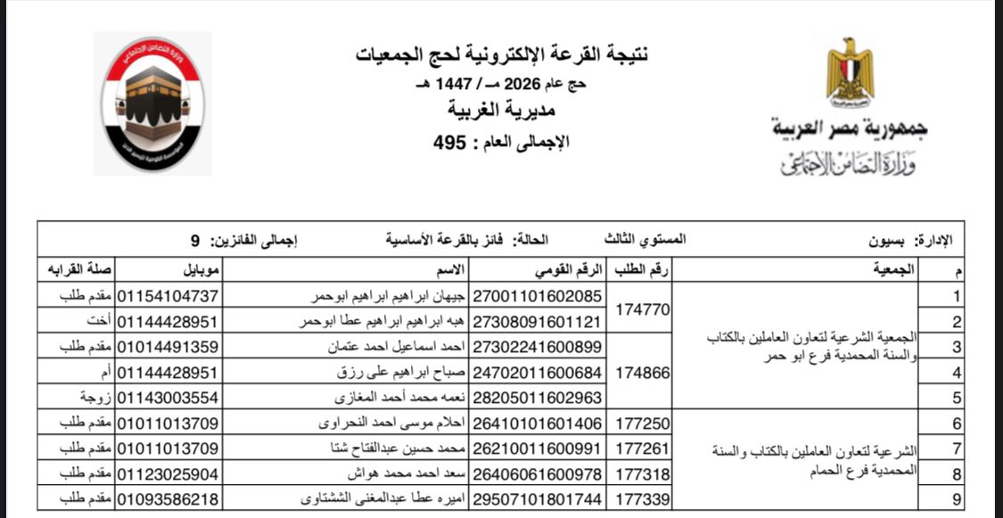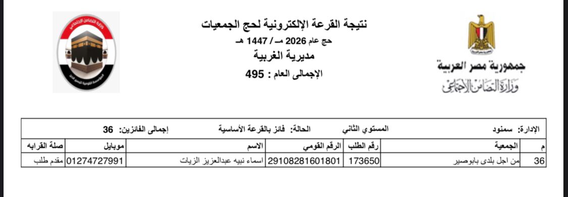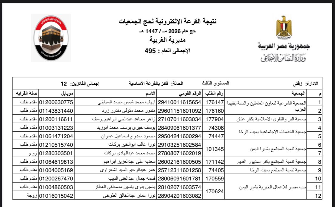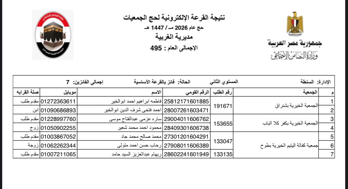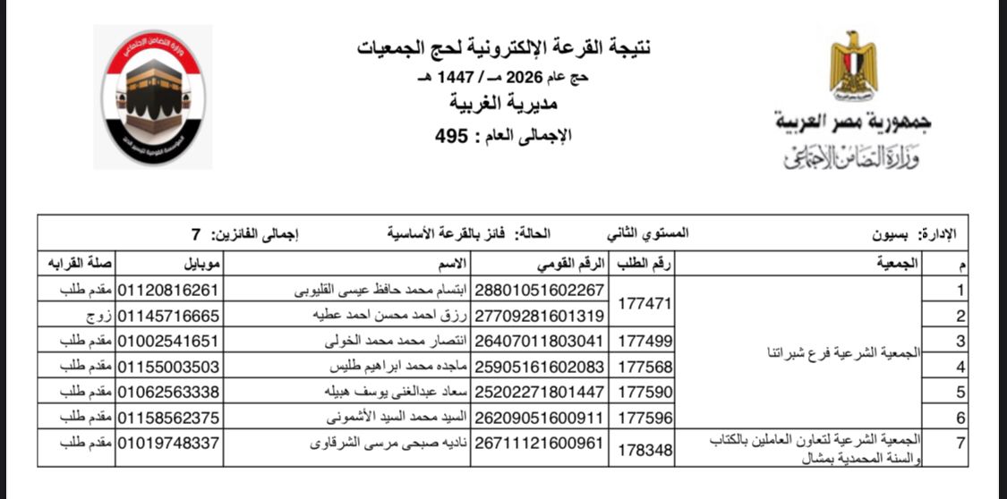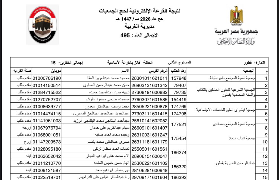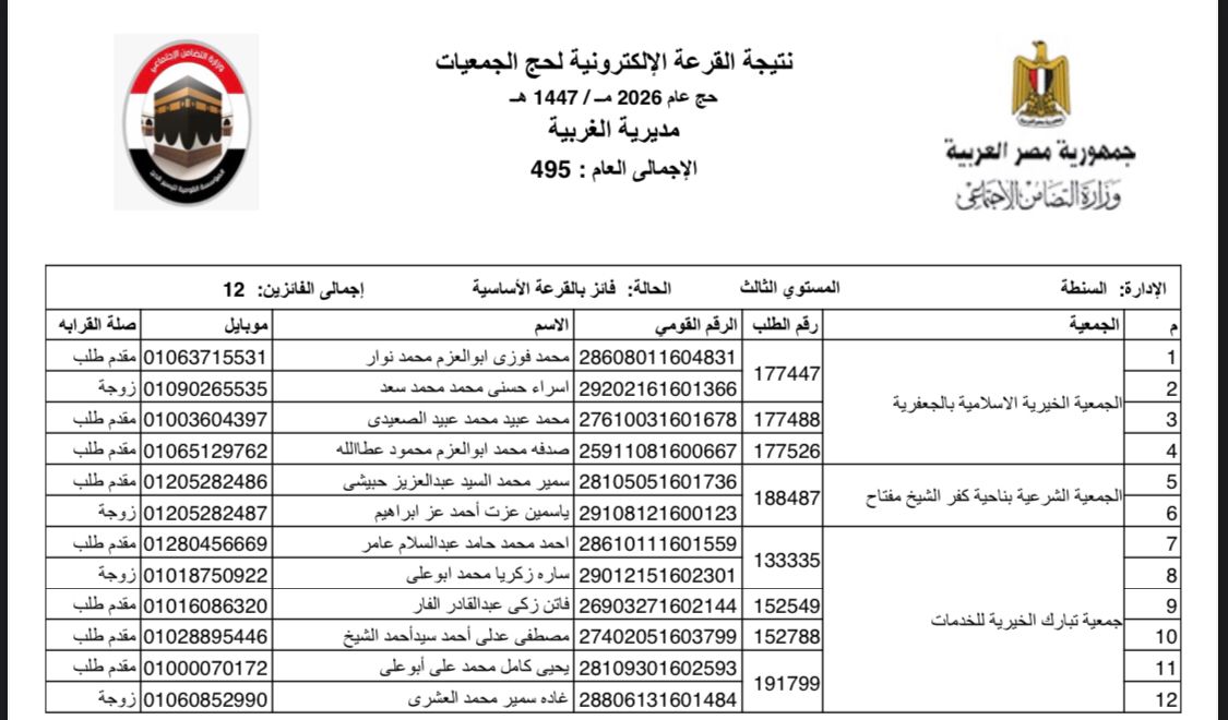 أعلن اللواء أشرف الجندي محافظ الغربية اليوم السبت، نتائج القرعة الإلكترونية لاختيار حجاج الجمعيات الأهلية لموسم 1447هـ – 2026م موجها خالص التهاني إلى المواطنين الذين حالفهم الحظ هذا العام، ومؤكدًا أن عملية الاختيار تمت من خلال منظومة إلكترونية دقيقة تضمن أعلى معايير الشفافية والنزاهة.