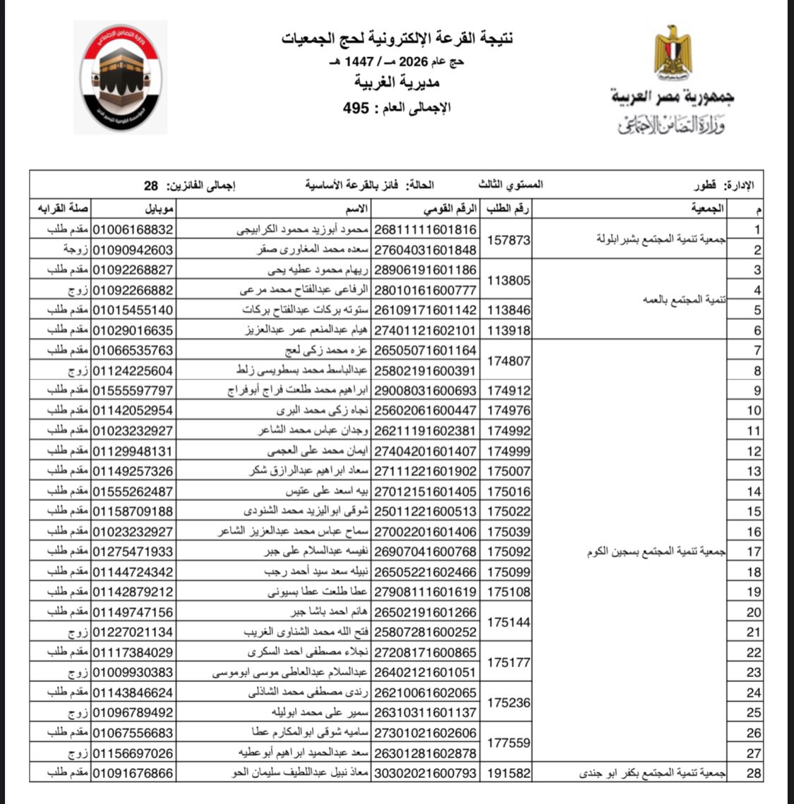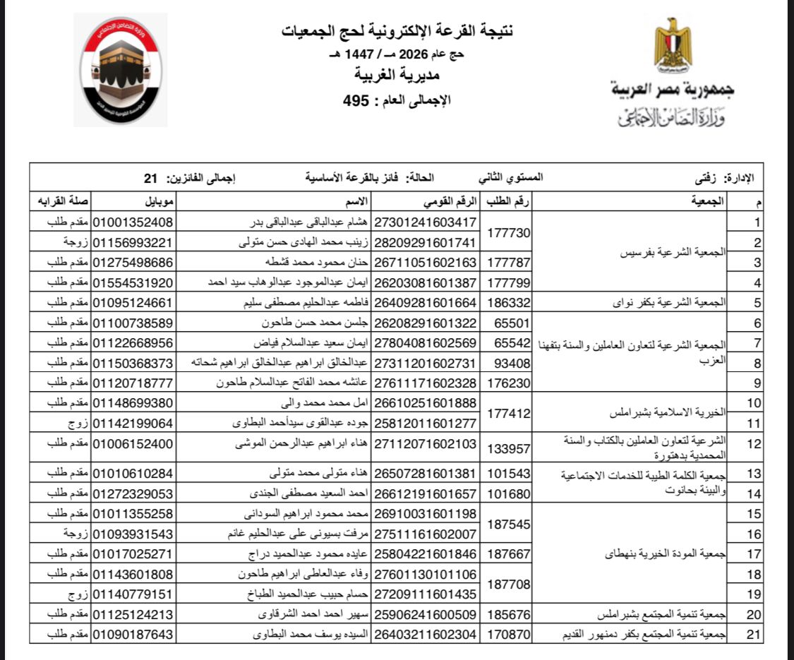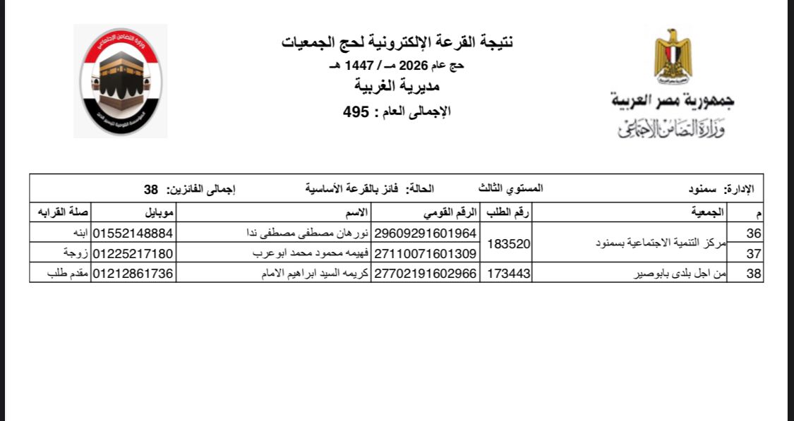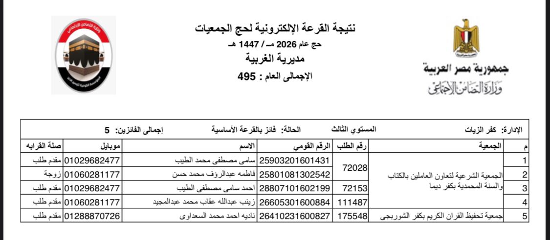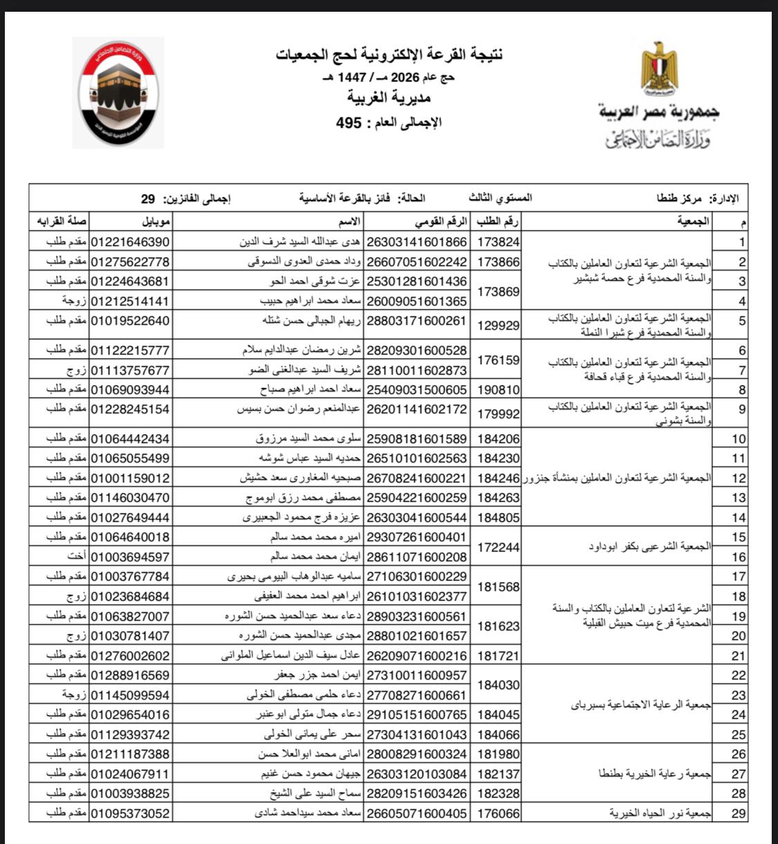 أعلن اللواء أشرف الجندي محافظ الغربية اليوم السبت، نتائج القرعة الإلكترونية لاختيار حجاج الجمعيات الأهلية لموسم 1447هـ – 2026م موجها خالص التهاني إلى المواطنين الذين حالفهم الحظ هذا العام، ومؤكدًا أن عملية الاختيار تمت من خلال منظومة إلكترونية دقيقة تضمن أعلى معايير الشفافية والنزاهة.