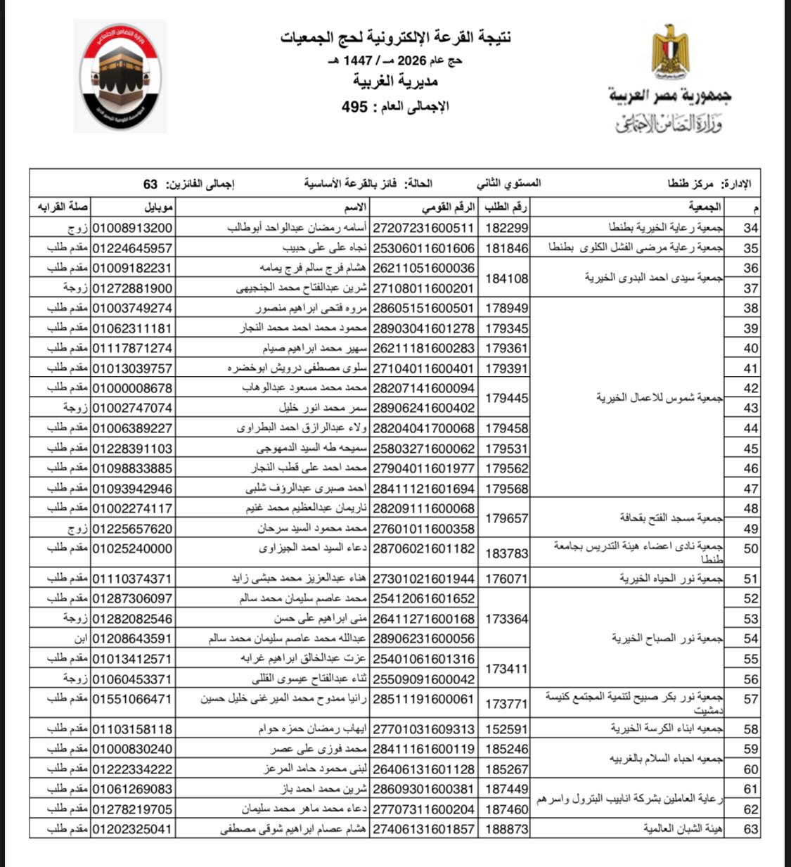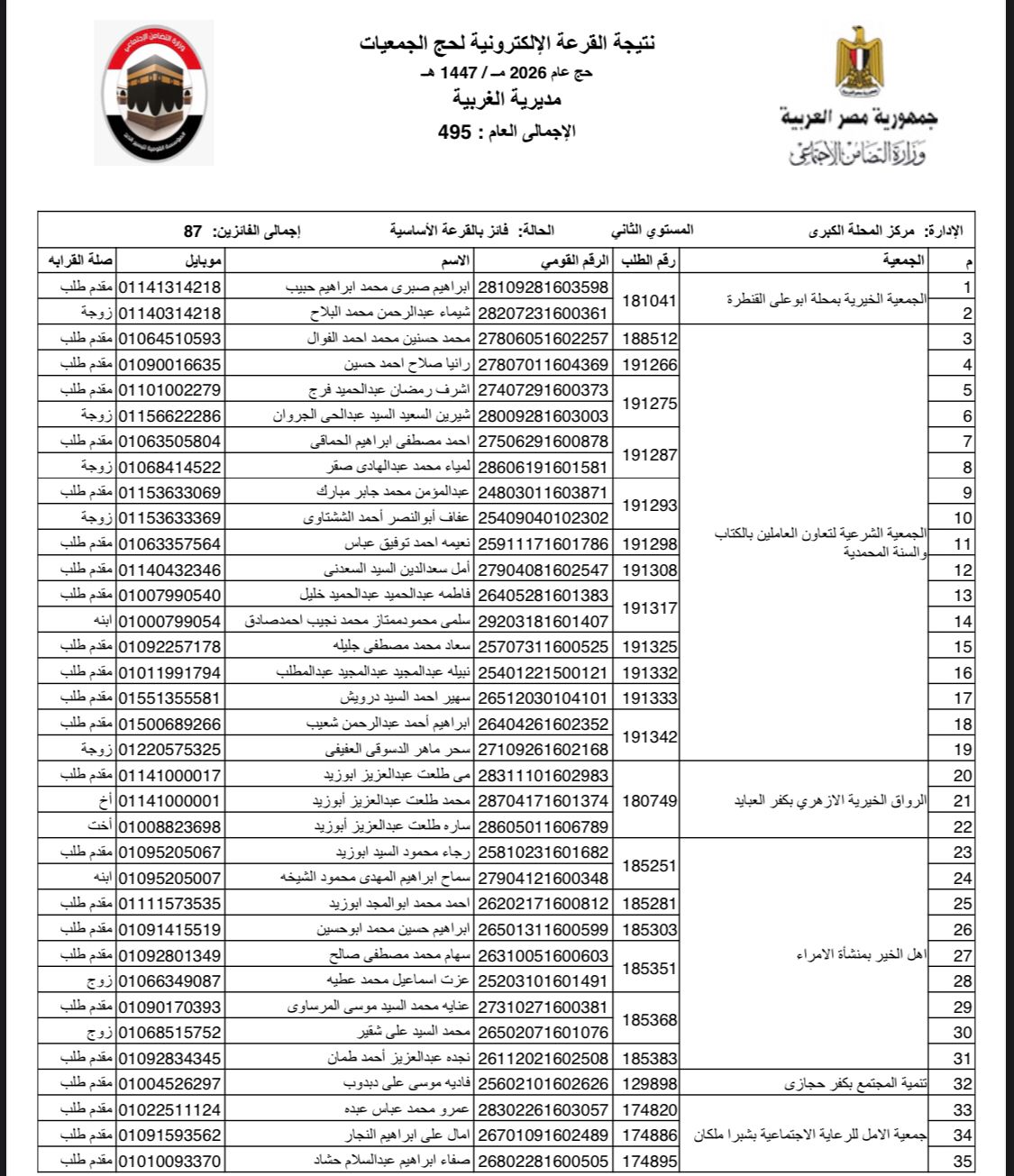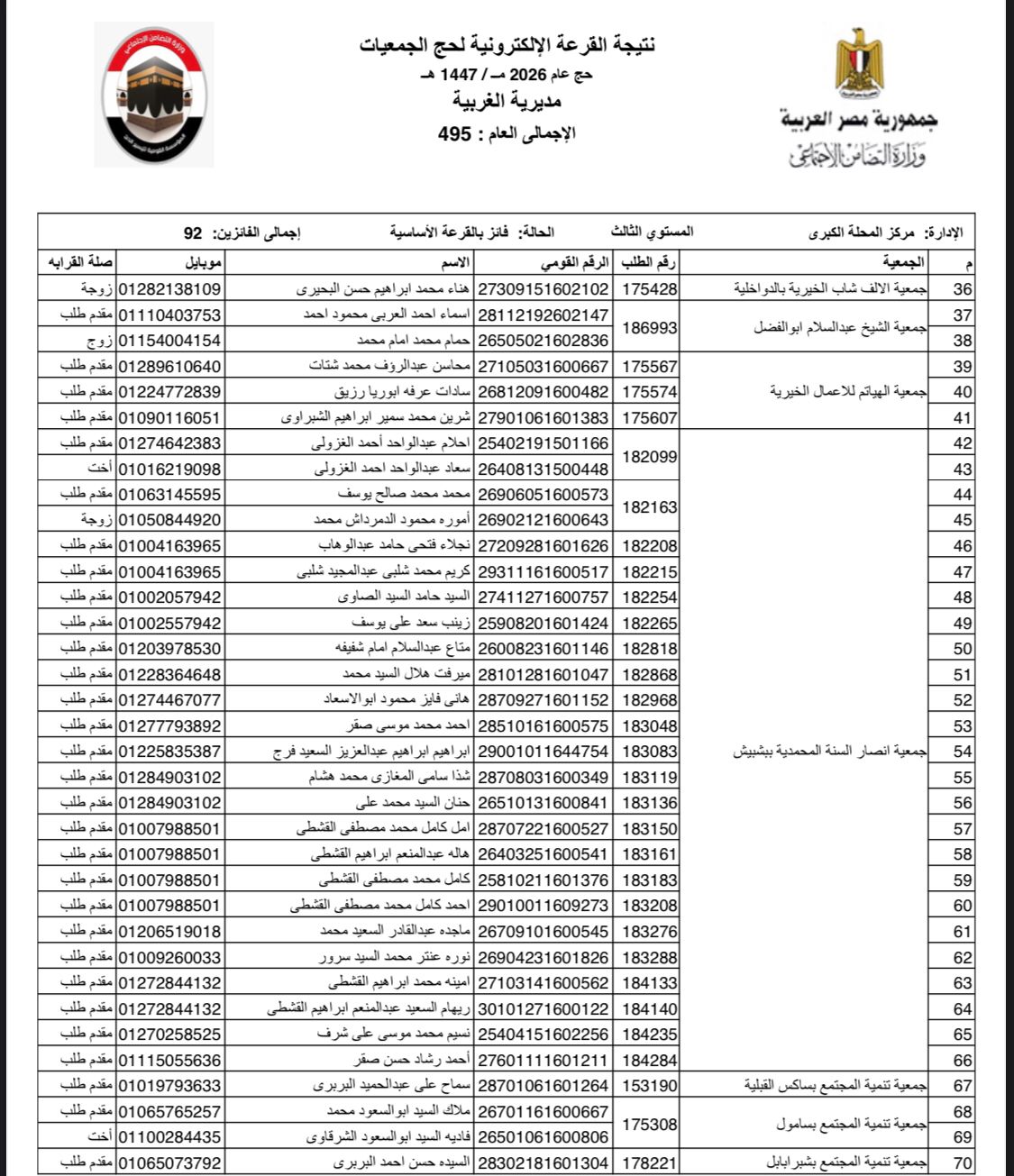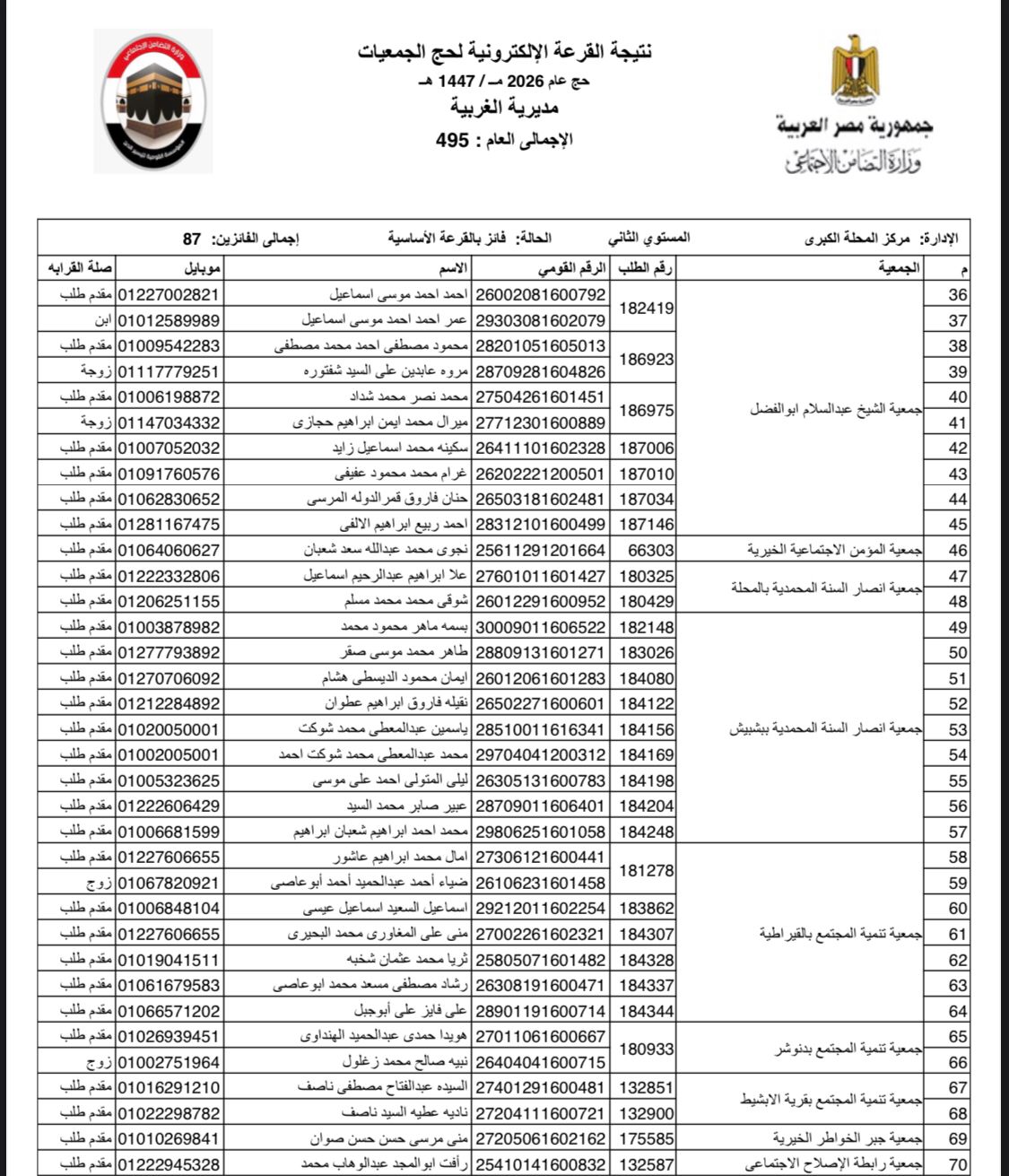 أعلن اللواء أشرف الجندي محافظ الغربية اليوم السبت، نتائج القرعة الإلكترونية لاختيار حجاج الجمعيات الأهلية لموسم 1447هـ – 2026م موجها خالص التهاني إلى المواطنين الذين حالفهم الحظ هذا العام، ومؤكدًا أن عملية الاختيار تمت من خلال منظومة إلكترونية دقيقة تضمن أعلى معايير الشفافية والنزاهة.