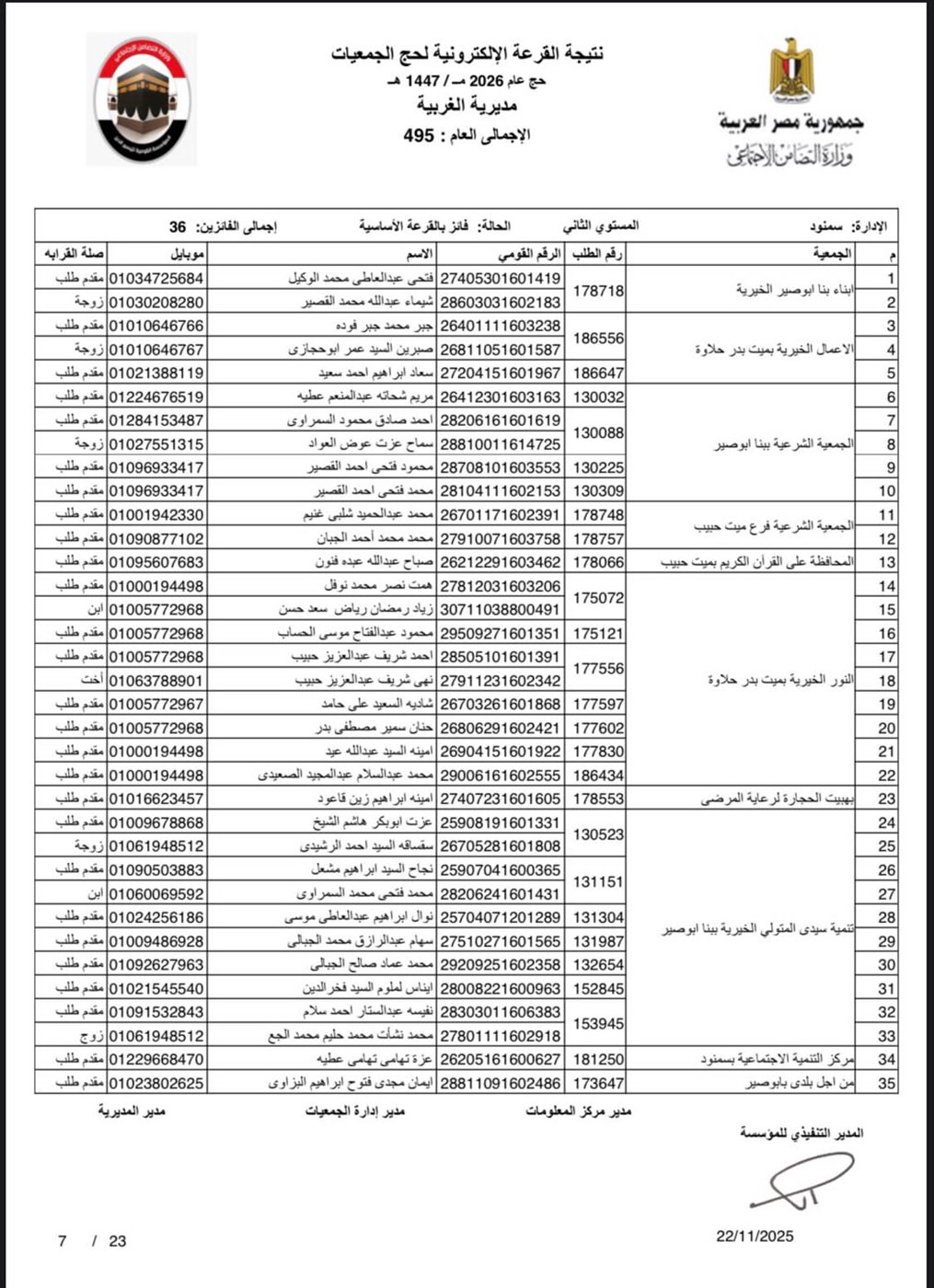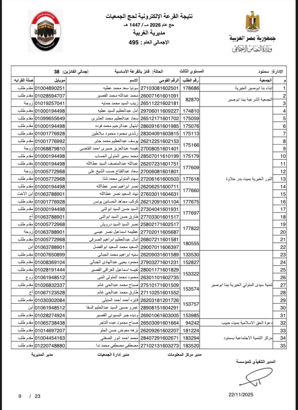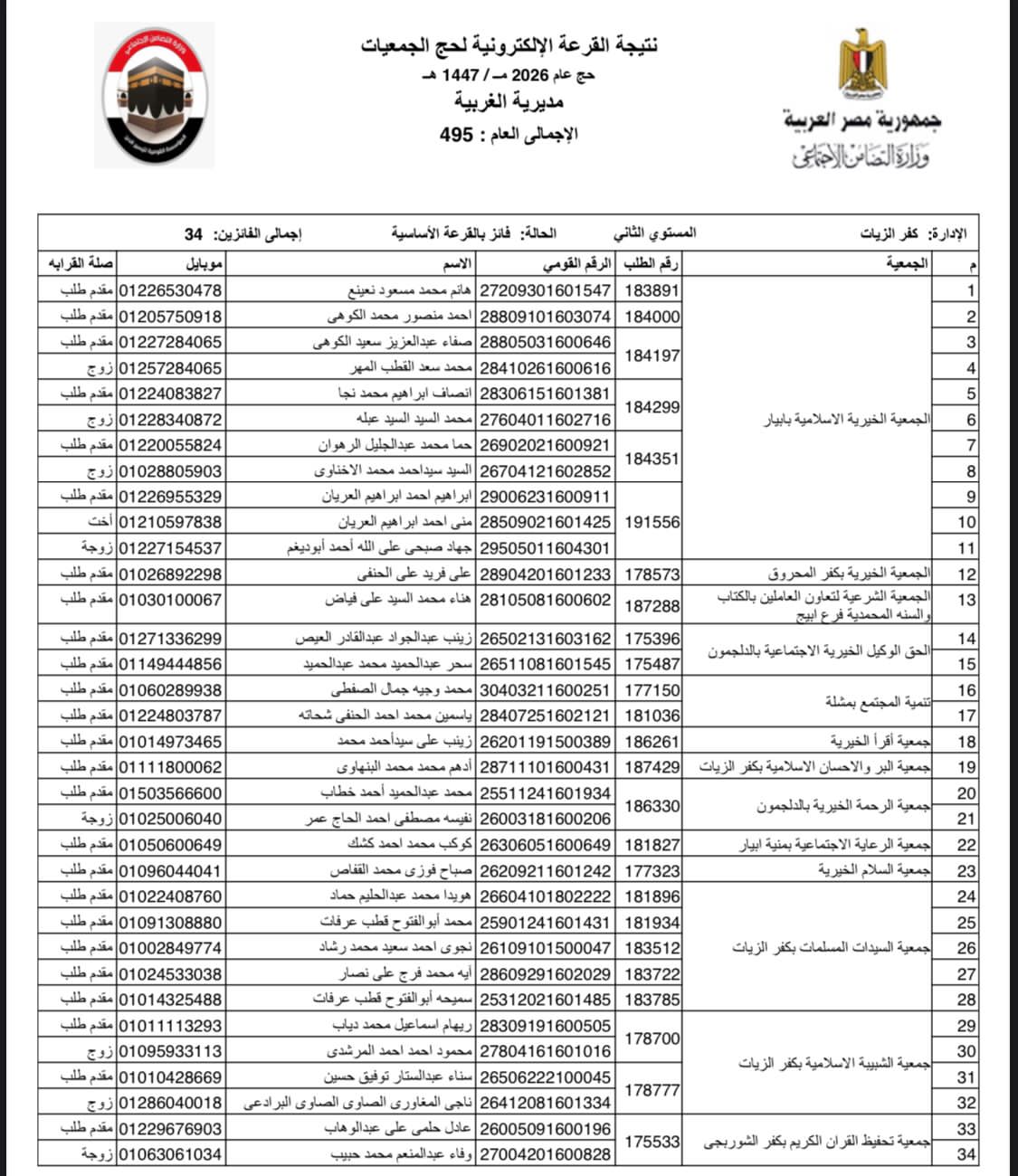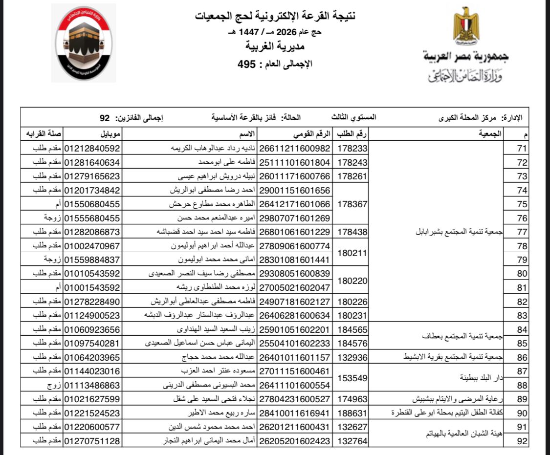 أعلن اللواء أشرف الجندي محافظ الغربية اليوم السبت، نتائج القرعة الإلكترونية لاختيار حجاج الجمعيات الأهلية لموسم 1447هـ – 2026م موجها خالص التهاني إلى المواطنين الذين حالفهم الحظ هذا العام، ومؤكدًا أن عملية الاختيار تمت من خلال منظومة إلكترونية دقيقة تضمن أعلى معايير الشفافية والنزاهة.