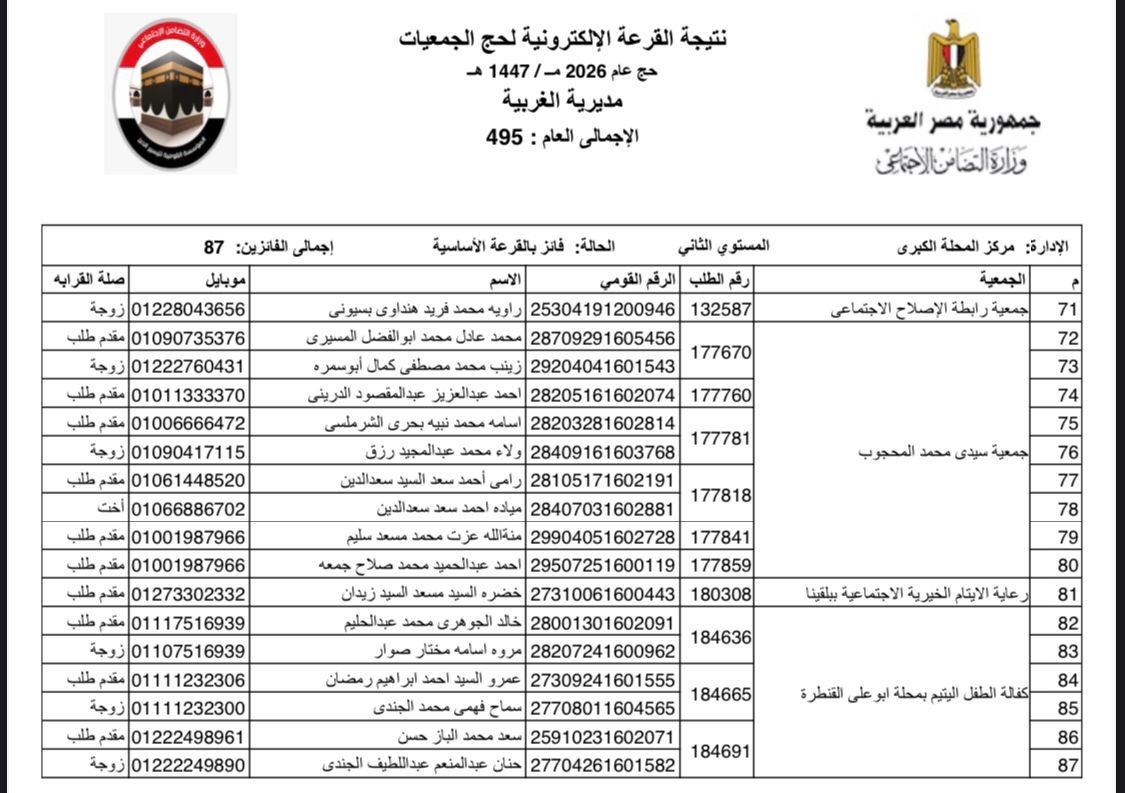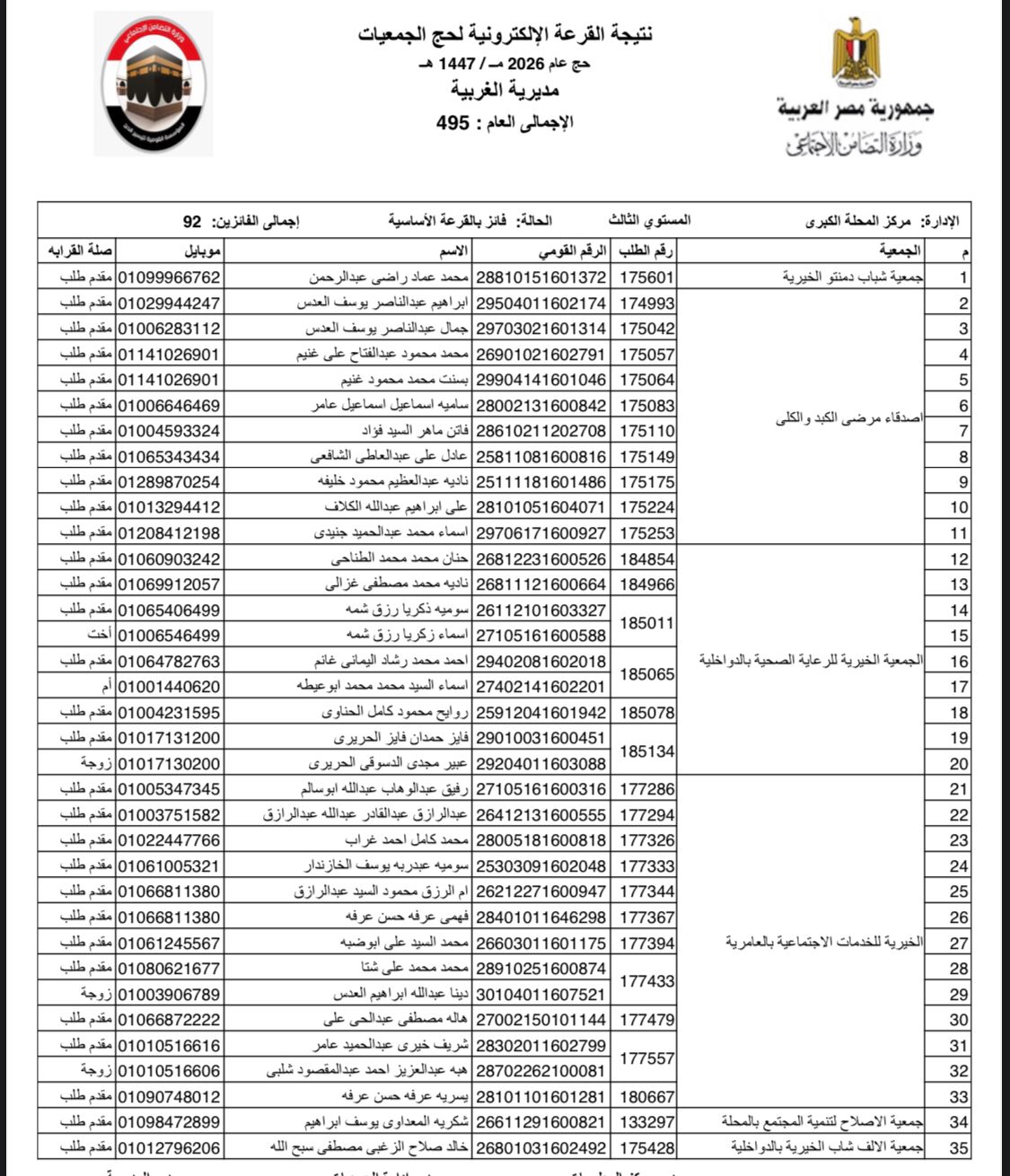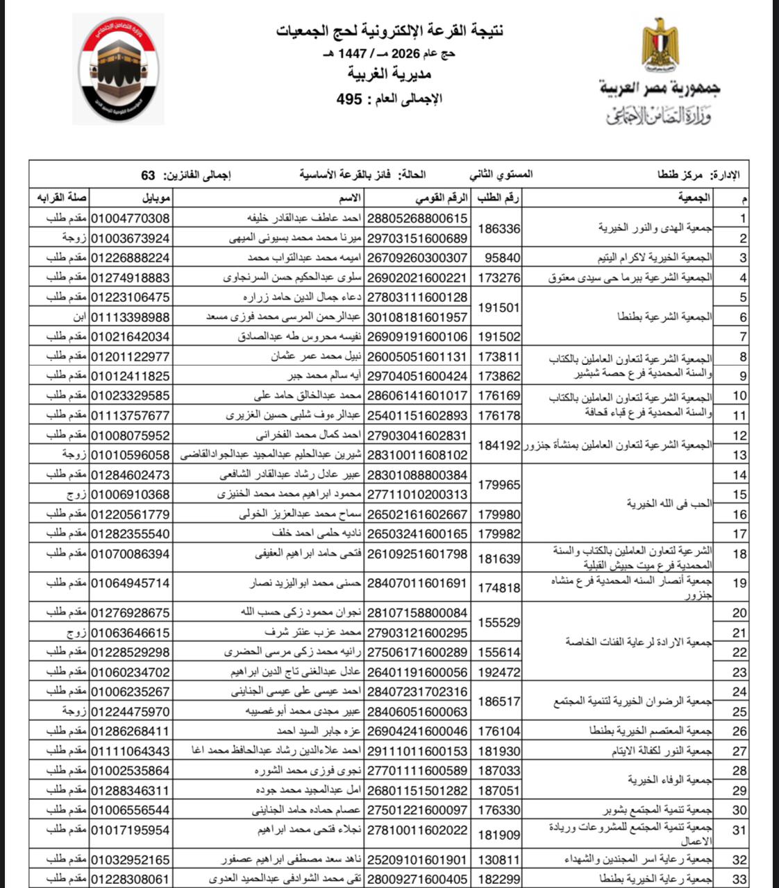 محافظ الغربية يعلن أسماء الفائزين في القرعة الإلكترونية لحج الجمعيات الأهلية