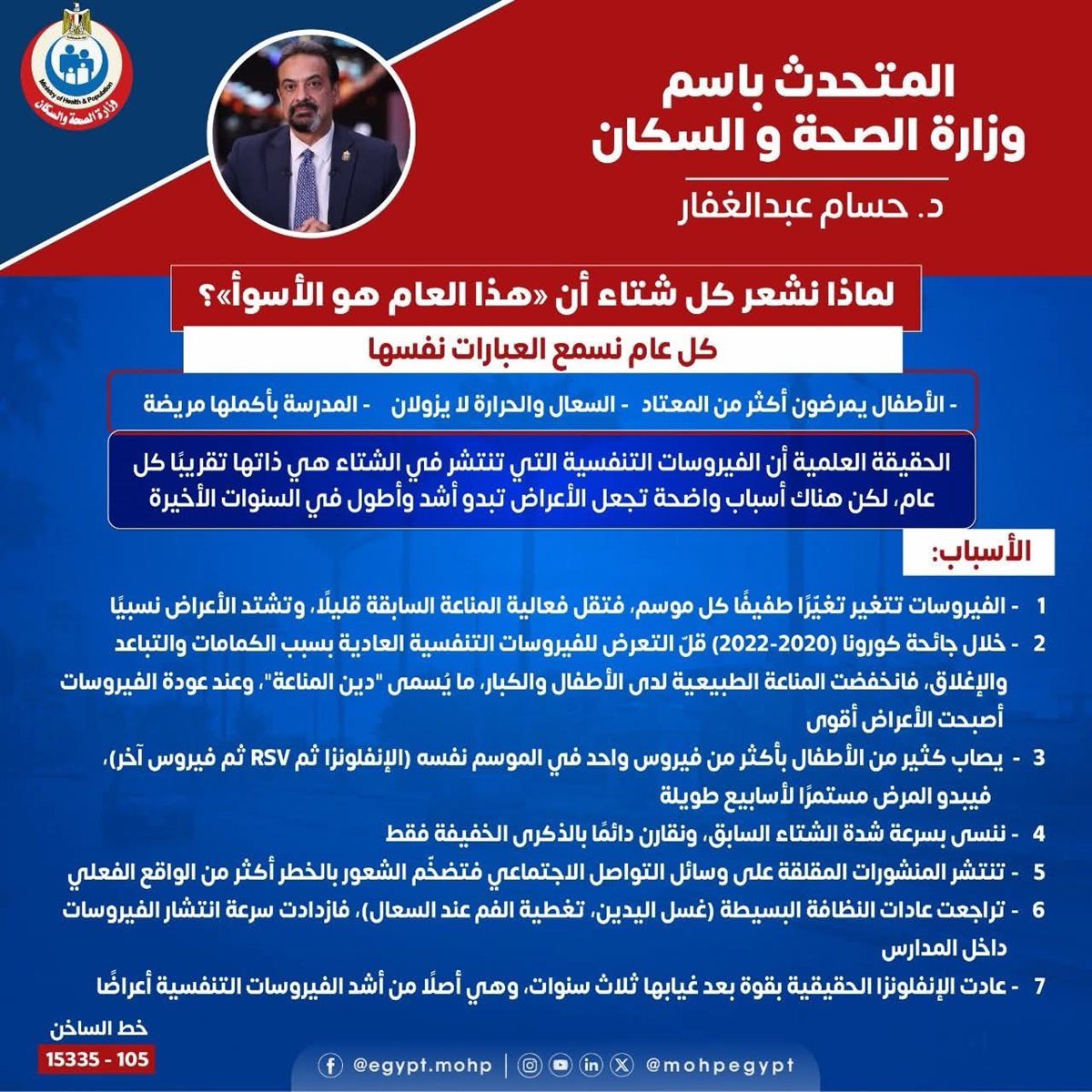 أكد متحدث وزارة الصحة أن الشتاء الحالي لا يشير إلى وجود وباء جديد، لكنه بالفعل أكثر صعوبة منذ 2023 نتيجة ضعف المناعة المؤقت وبعض التغيرات الطبيعية. وتشير الدراسات العالمية إلى أن الأمور ستعود تدريجيًا إلى طبيعتها بحلول شتاء 2026–2027.