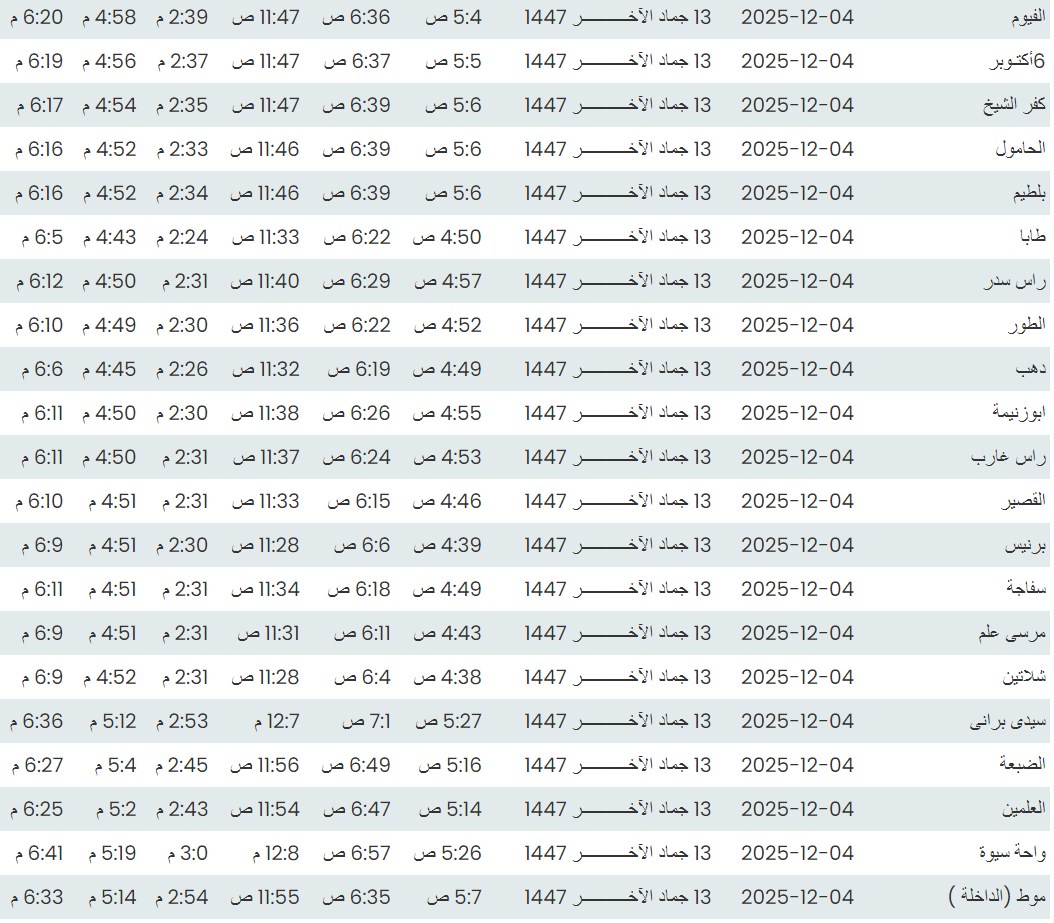وفيما يلي مواقيت الصلاة، لعدد من مدن ومحافظات الجمهورية من واقع بيانات الهيئة العامة للمساحة