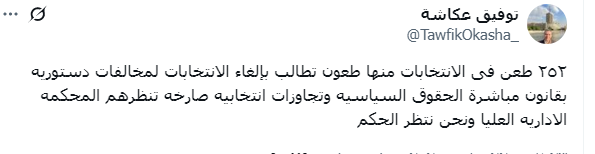 وقال توفيق عكاشة، عبر منصة “إكس”، عن الطعون المقدمة بشأن الانتخابات ومحاولة إلغائها: “٢٥٢ طعن فى الانتخابات منها طعون تطالب بإلغاء الانتخابات لمخالفات دستورية بقانون مباشرة الحقوق السياسية وتجاوزات انتخابية صارخة تنظرها المحكمة الإدارية العليا ونحن ننتظر الحكم”.
