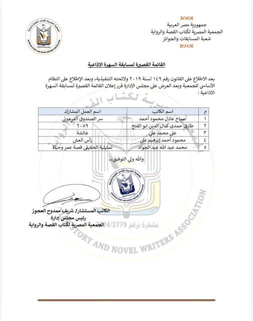 أعلنت شعبة الجوائز والمسابقات بالجمعية المصرية لكتاب القصة والرواية بعد اعتماد مجلس ادارة الجمعية وتصديق الكاتب شريف العجوز رئيس الجمعية، عن القائمة القصيرة لمسابقة السهرات الإذاعية للعام 2025، وذلك بعد انتهاء لجنة التحكيم من مراجعة الأعمال المتأهلة من القائمة الطويلة، واختيار النصوص التي استوفت العناصر الفنية والدرامية اللازمة لإنتاج عمل إذاعي متكامل.