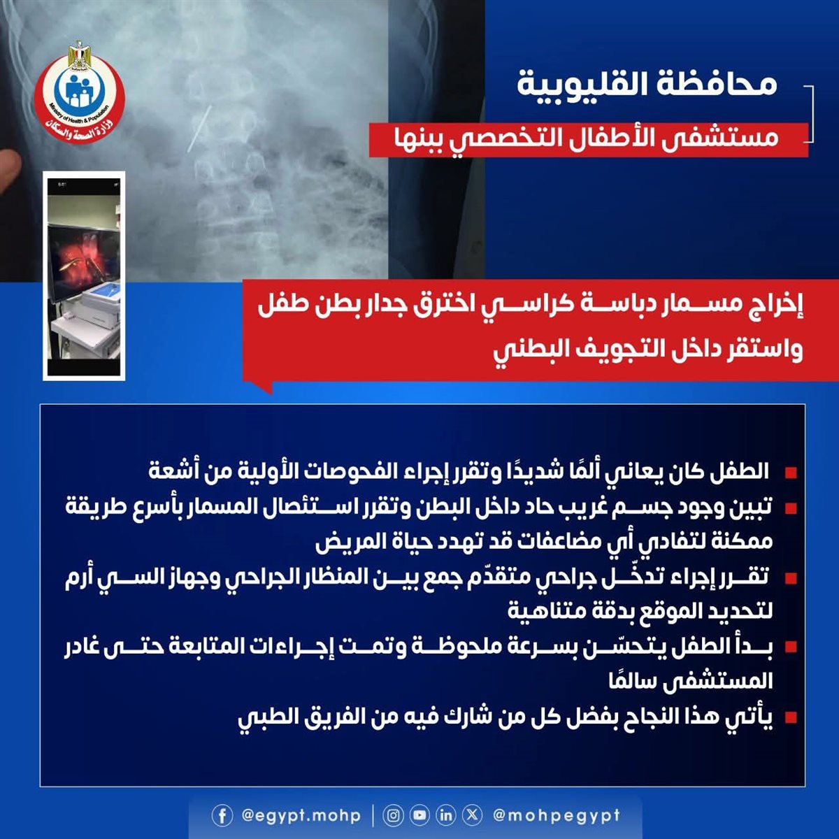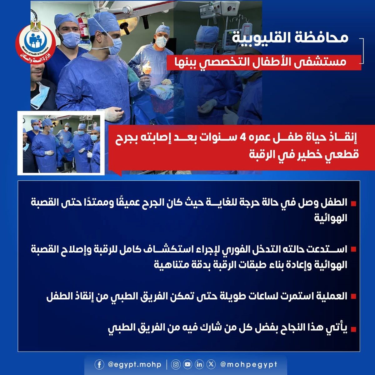 أعلنت وزارة الصحة عن نجاح مستشفى الأطفال التخصصي ببنها، بمحافظة القليوبية، الفرق الطبية في إنقاذ طفلين في حالتين نادرتين وشديدتي الخطورة.