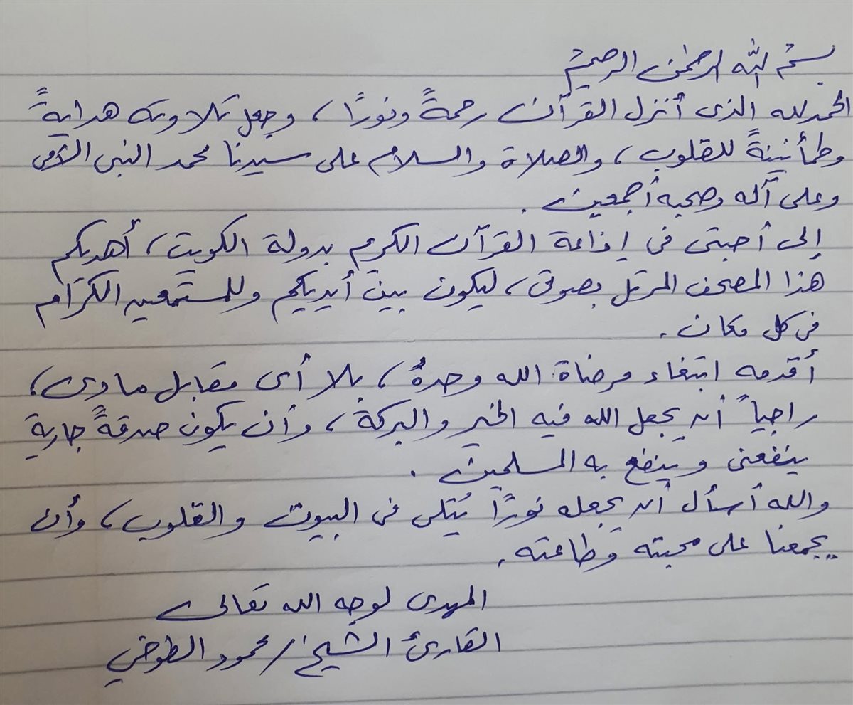 أهدى القارئ الشيخ محمود الطوخي إذاعة القرآن الكريم بالكويت نسخة من المصحف المرتل بصوته.