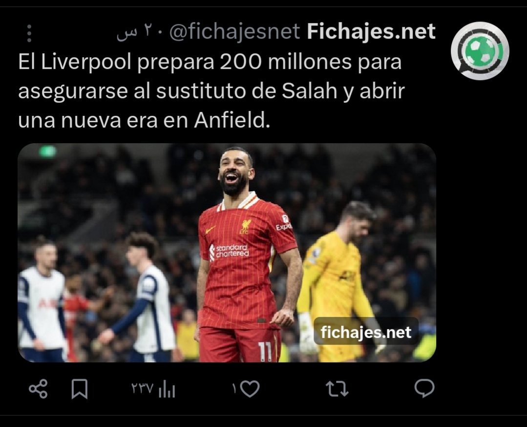 وذكر موقع Fichajes الإسباني أن إدارة ليفربول بدأت بالفعل التخطيط لمرحلة ما بعد محمد صلاح، حيث أبدت استعدادها لاستثمار 200 مليون جنيه إسترليني للتعاقد مع بديل قوي يعيد الفريق إلى طريق الانتصارات.
