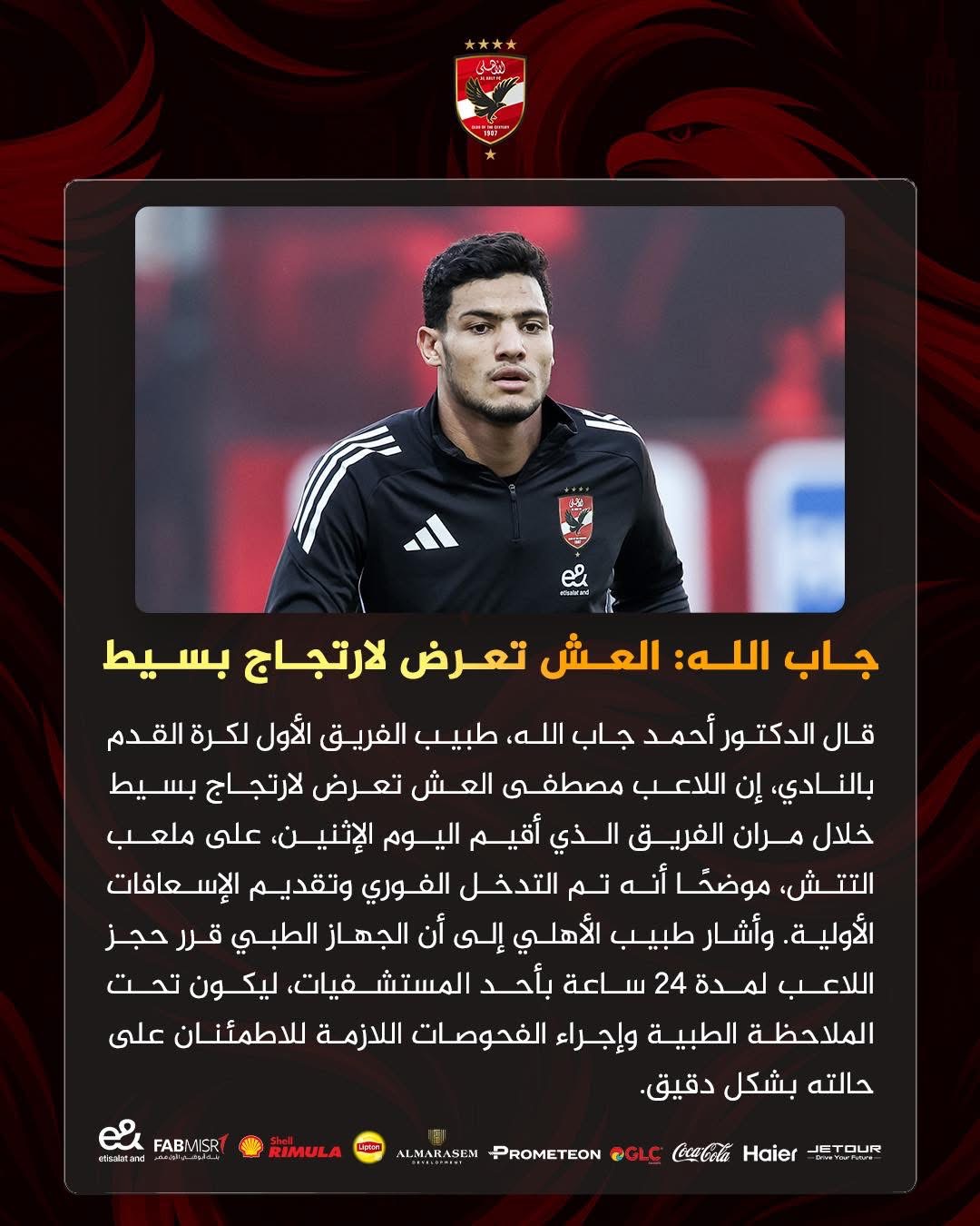وقال جاب الله، إن العش تعرض لارتجاج بسيط في المخ خلال مران اليوم، مشيرًا إلى أن الجهاز الطبي فضل حجز اللاعب لمدة 24 في أحد المستشفيات ليكون تحت الملاحظة وإجراء الفحوصات الطبية للاطمئنان عليه بشكل دقيق.
