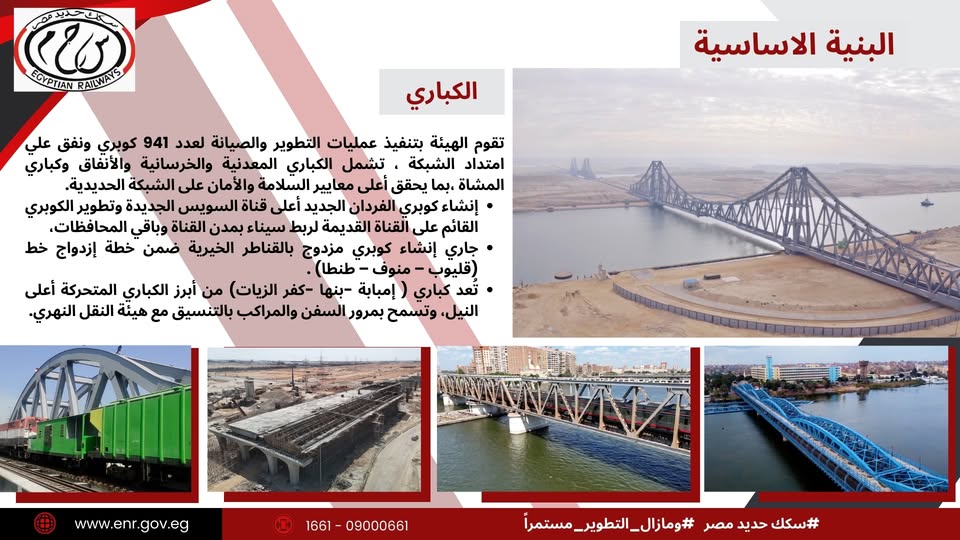 وأضافت أنه من أهم هذه المشروعات، إنشاء كوبري الفردان الجديد أعلى قناة السويس الجديدة وتطوير الكوبري القائم لربط سيناء بمدن القناة وباقي المحافظات، إلى جانب إنشاء كوبري مزدوج بالقناطر الخيرية ضمن خطة ازدواج خط (قليوب – منوف – طنطا). كما تعد كباري إمبابة وبنها وكفر الزيات من أبرز الكباري المتحركة على النيل، حيث تتيح حركة الملاحة ومرور السفن بالتنسيق مع هيئة النقل النهري.