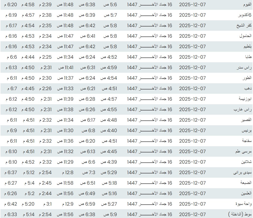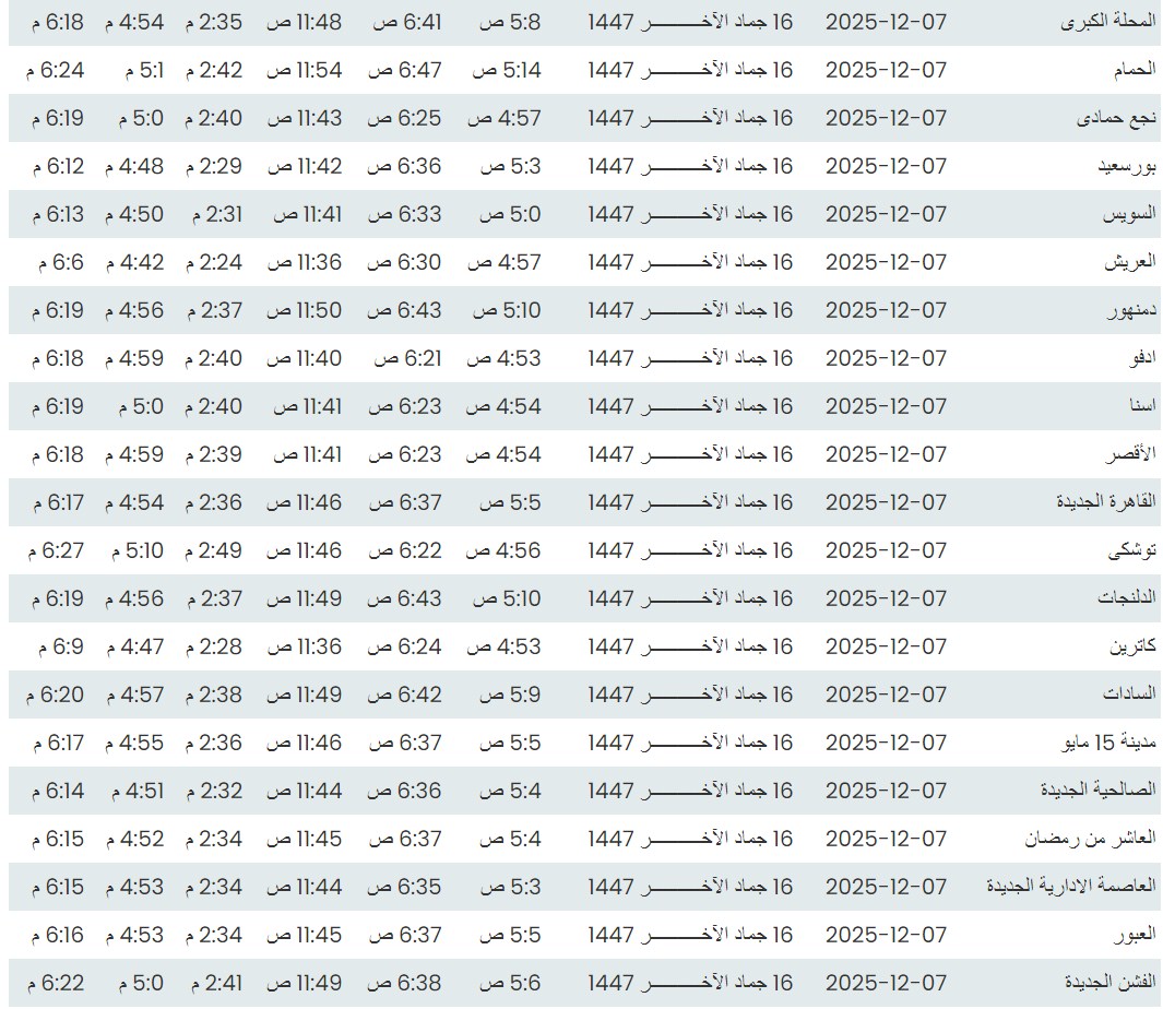وفيما يلي مواقيت الصلاة، لعدد من مدن ومحافظات الجمهورية من واقع بيانات الهيئة العامة للمساحة