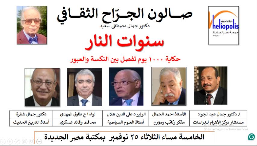 تنطلق فى الساعة الخامسة من مساء اليوم الثلاثاء، فعاليات صالون الجراح الثقافى الشهرى، التى تستضيفه مكتبة مصر الجديدة وتشهده مكتبتها العامة تحت عنوان" سنوات النار.. حكاية 1000 يوم تفصل بين النكسة والعبور" والذي ترعاه جمعية مصر الجديدة برئاسة الدكتورة سهام الجوهرى وصالون الجراح الثقافى برئاسة الدكتور جمال مصطفى سعيد.