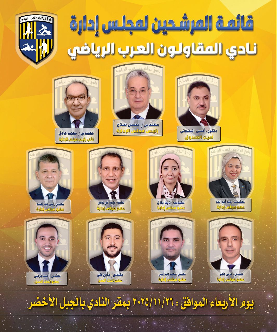 وجاءت قائمة واحدة للمرشحين لمجلس إدارة نادي المقاولون العرب كالتالي..