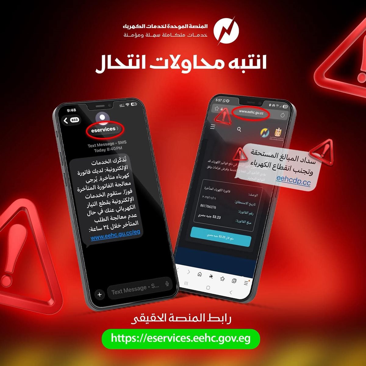 وأوضحت المنصة الموحدة لخدمات الكهرباء أنه رصدت خلال الساعات الماضية استخدام الروابط التالية في عمليات احتيال تحت أسماء: «eehc. gu. cc/eg، eehcdp.cc»، مؤكدة أن هذه الروابط غير تابعة للوزارة أو المنصة الموحدة لخدمات الكهرباء، وتهدف إلى الإستيلاء على بيانات المواطنين وأموالهم بشكل غير قانوني.