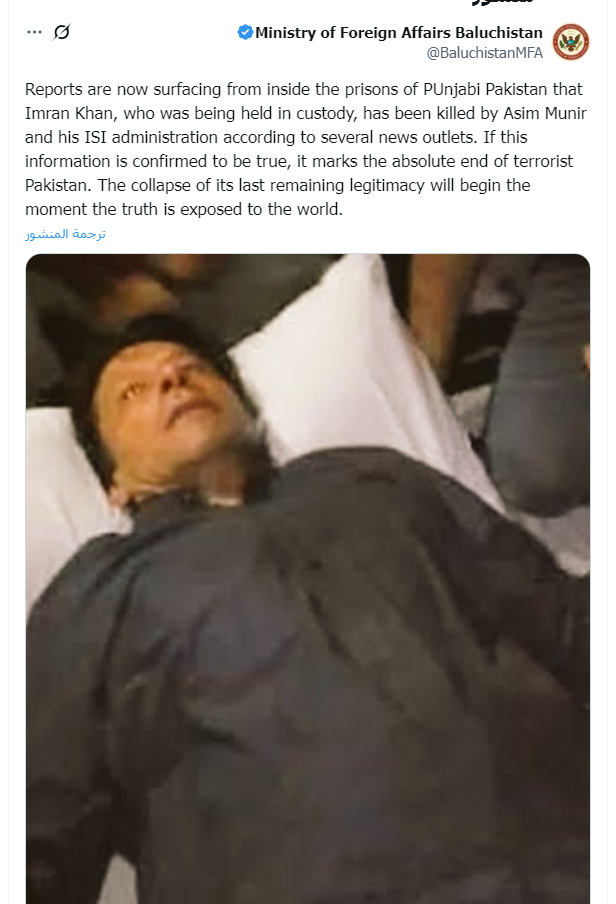 وأدعت الصفحة المعارضة من إقليم بلوشستان، بوجود تقارير تشير لمقتل عمران خان في سجنه، وكتبت الصفحة "تتوالى التقارير من داخل سجون باكستان، حيث تفيد بمقتل عمران خان، المحتجز سابقًا، على يد عاصم منير وإدارته في جهاز المخابرات الباكستاني، وفقًا لعدة وسائل إعلام. إذا تأكدت صحة هذه المعلومات، فإنها تُمثل نهاية باكستان تمامًا. وسيبدأ انهيار آخر ما تبقى من شرعيتها لحظة كشف الحقيقة للعالم".