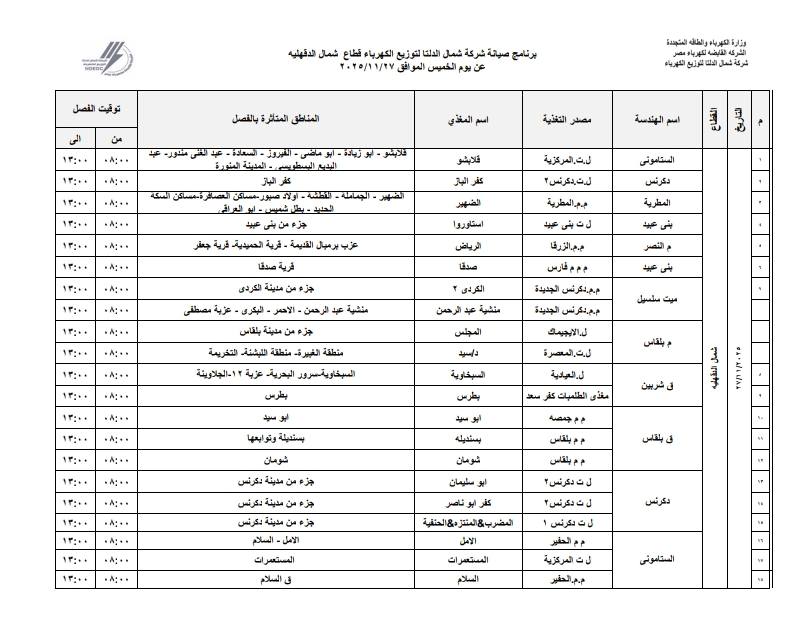 وأعلنت شركة شمال الدلتا لتوزيع الكهرباء برنامج أعمال الصيانة المجدولة التي ستستلزم فصل التيار الكهربائي عن عدد من المناطق التابعة للمحافظات الثلاث: (دمياط - الدقهلية - كفر الشيخ).