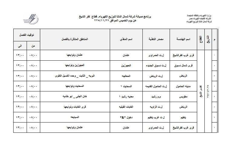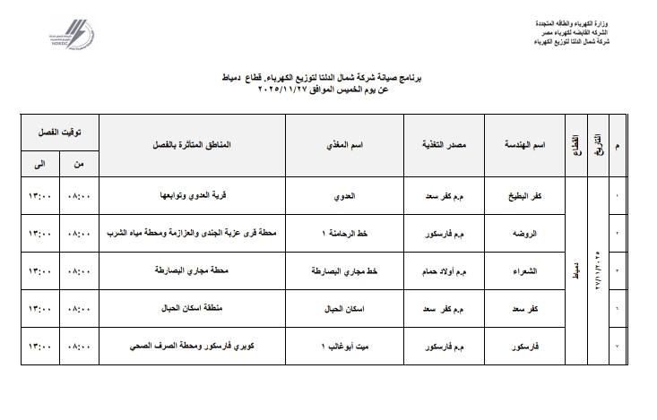 أعلنت شركة شمال الدلتا لتوزيع الكهرباء انقطاع التيار الكهربائي اليوم الخميس 27 نوفمبر 2025 عن عدة مناطق في 3 محافظات (الدقهلية - دمياط - كفر الشيخ).