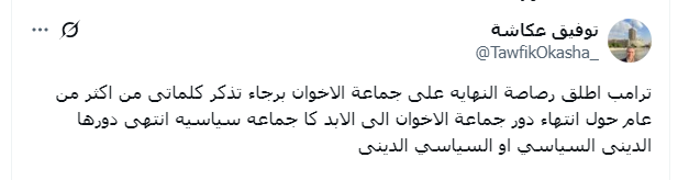 وقال توفيق عكاشة، عبر منصة "أكس"، في تعليقه على قرار ترامب بـ إدراج جماعة الإخوان منظمة رهابية: " ترامب أطلق رصاصة النهاية على جماعة الإخوان برجاء تذكر كلماتي من أكثر من عام حول انتهاء دور جماعة الإخوان إلى الأبد كجماعة سياسية انتهى دورها الديني السياسي أو السياسي الدينى"