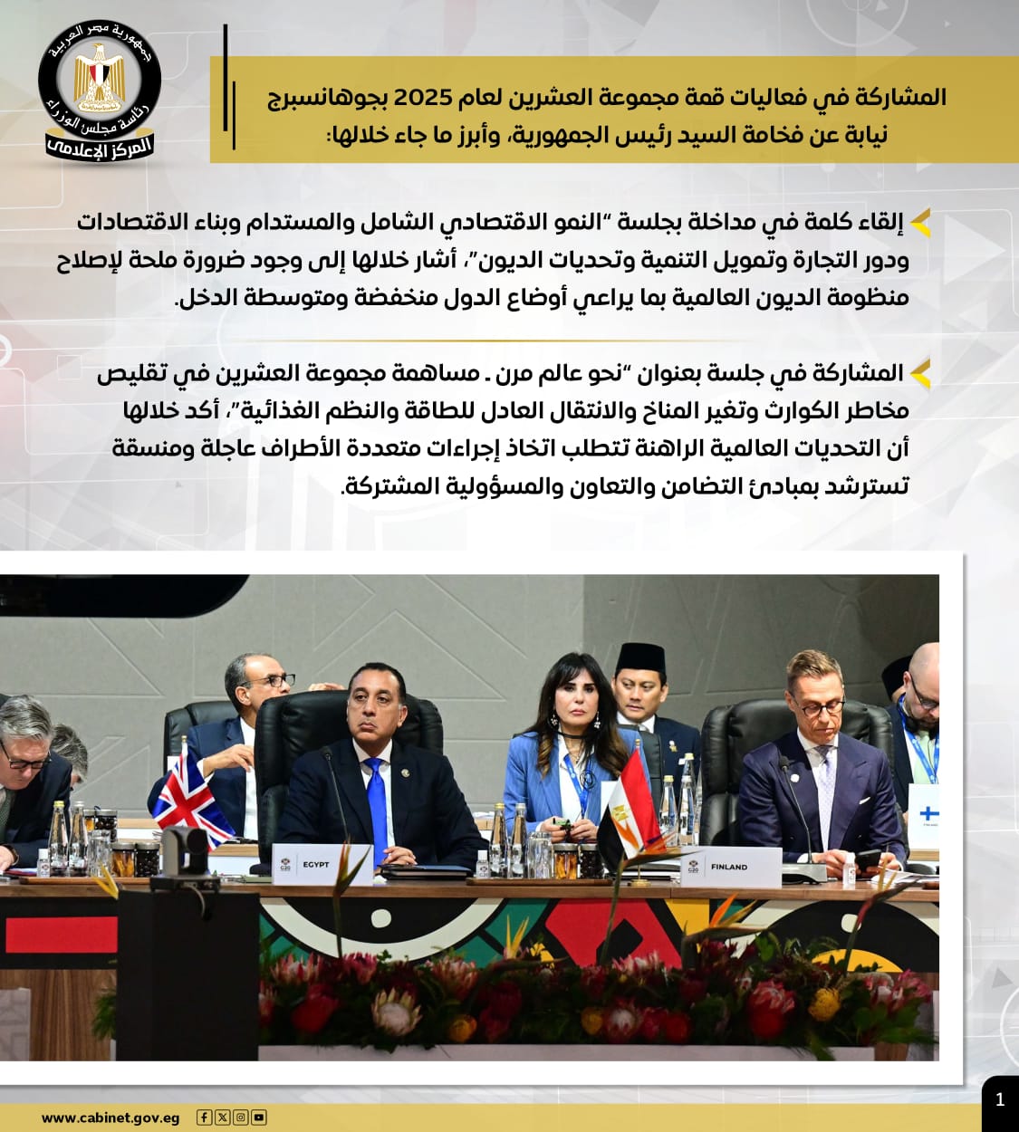 وفي إطار ذلك، شارك الدكتور مدبولي، نيابةً عن رئيس الجمهورية، في قمة مجموعة العشرين بجوهانسبرج، حيث شدد على ضرورة إصلاح منظومة الديون العالمية لمراعاة أوضاع الدول منخفضة ومتوسطة الدخل، مؤكداً أن التحديات الراهنة تتطلب إجراءات عاجلة ومتعددة الأطراف تسترشد بمبادئ التضامن والتعاون والمسؤولية المشتركة.
