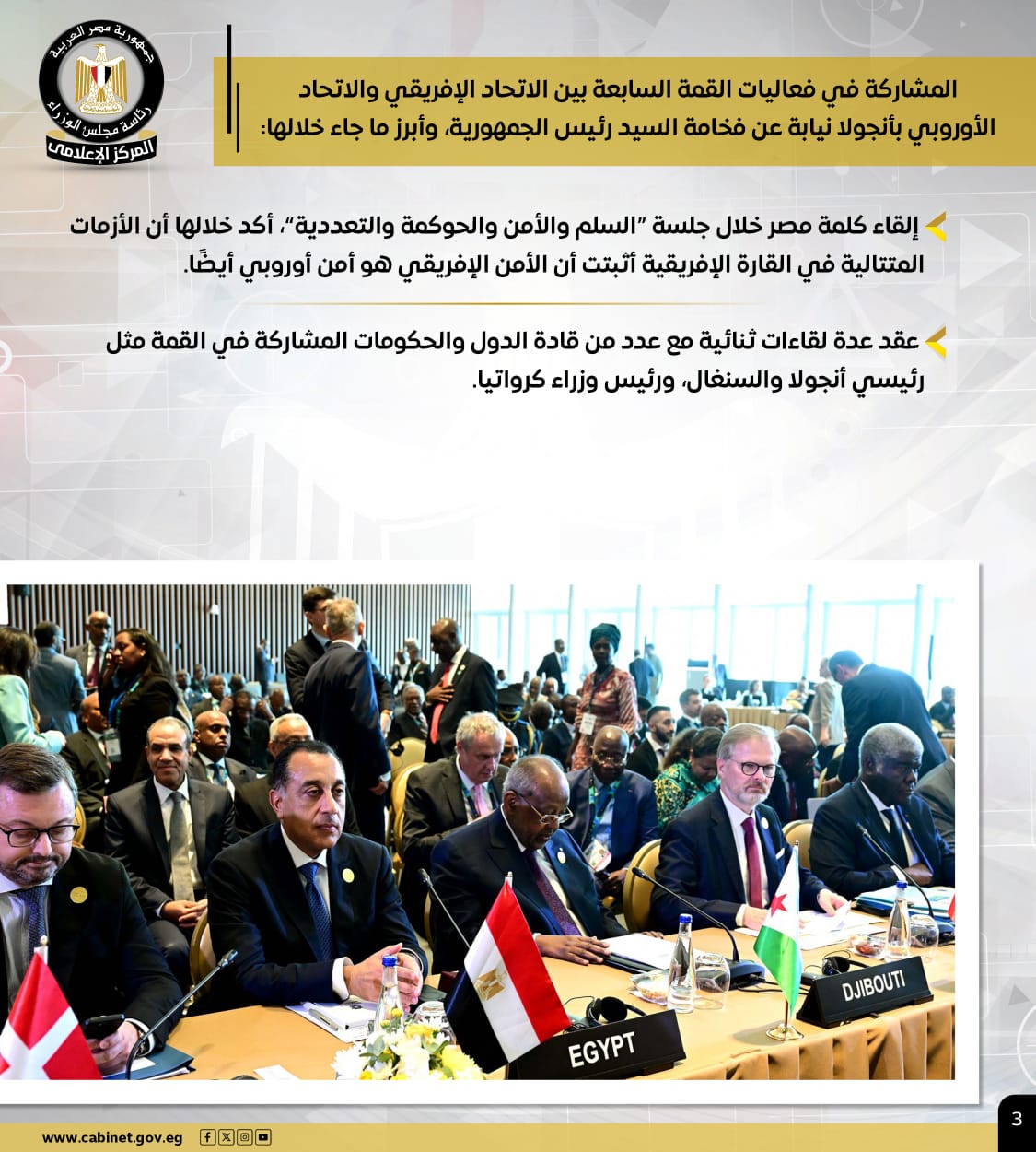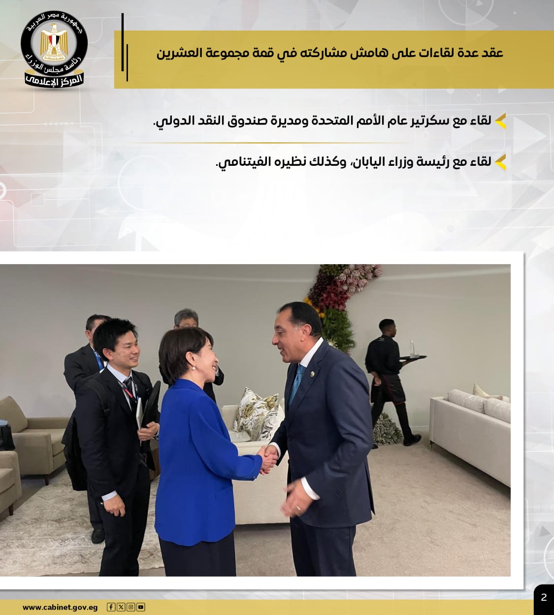 وعلى هامش قمة العشرين، عقد رئيس الوزراء لقاءات ثنائية مع السكرتير العام للأمم المتحدة، ومديرة صندوق النقد الدولي، ورئيسة وزراء اليابان، ونظيره الفيتنامي، كما شارك في القمة السابعة بين الاتحاد الإفريقي والاتحاد الأوروبي بأنجولا، نيابةً عن الرئيس، حيث أكد أن الأزمات المتتالية في القارة الإفريقية أثبتت أن الأمن الإفريقي هو أمن أوروبي أيضًا، وعقد عدة لقاءات ثنائية مع قادة دول وحكومات مشاركة في القمة.