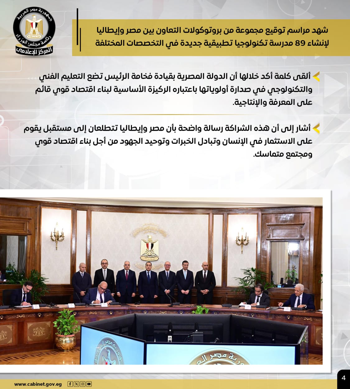 وفي سياق تعزيز الشراكات، شهد الدكتور مدبولي مراسم توقيع بروتوكولات تعاون مصرية-إيطالية لإنشاء 89 مدرسة تكنولوجيا تطبيقية جديدة في مختلف التخصصات، مؤكداً أولوية الدولة للتعليم الفني والتكنولوجي كركيزة أساسية لاقتصاد قوي.