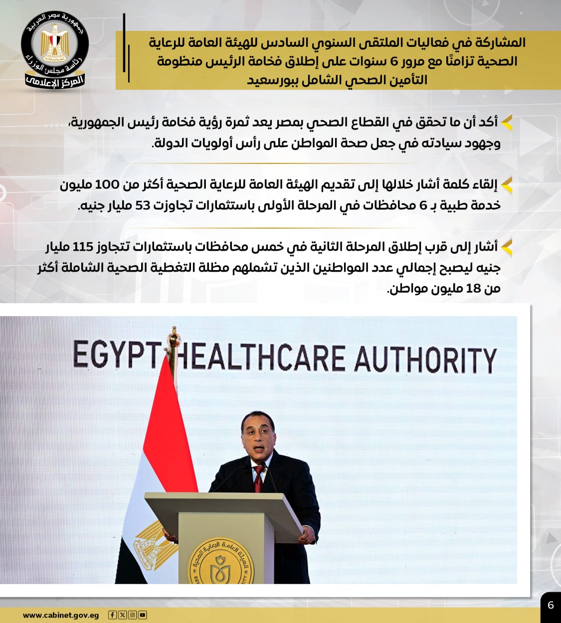 كما استعرض رئيس الوزراء، خلال الملتقى السنوي السادس للهيئة العامة للرعاية الصحية، الإنجازات المحققة في القطاع الصحي، مشيداً برؤية الرئيس في جعل صحة المواطن أولوية قصوى، وأشار إلى تقديم هيئة الرعاية الصحية لأكثر من 100 مليون خدمة طبية في محافظات المرحلة الأولى من منظومة التأمين الصحي الشامل، باستثمارات تجاوزت 53 مليار جنيه، وقرب إطلاق المرحلة الثانية باستثمارات تتجاوز 115 مليار جنيه لتغطية أكثر من 18 مليون مواطن.