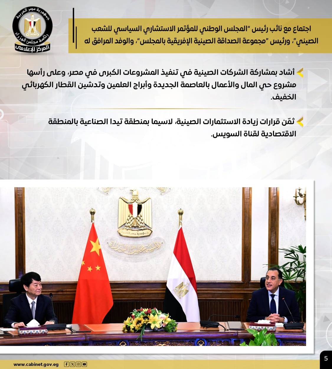 وفي لقاء مع وفد صيني رفيع المستوى، أشاد رئيس الوزراء بمساهمة الشركات الصينية في تنفيذ المشروعات الكبرى بمصر، وثمّن قرارات زيادة الاستثمارات الصينية، لاسيما بمنطقة "تيدا" الصناعية بالمنطقة الاقتصادية لقناة السويس.