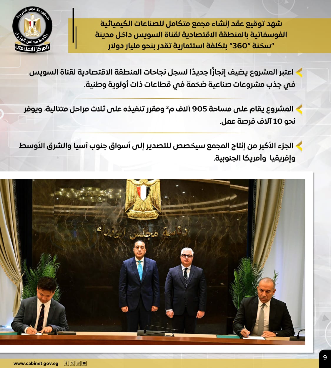 وفي الشأن الداخلي، شهد رئيس الوزراء انطلاق أعمال المؤتمر الوطني رفيع المستوى حول "إصلاح وتمكين الإدارة المحلية"، مشيداً ببرنامج التنمية المحلية بصعيد مصر كقصة نجاح وطنية ونموذج دولي يحتذى به، كما شهد توقيع عقد إنشاء مجمع متكامل للصناعات الكيميائية الفوسفاتية بمدينة "سخنة 360" باستثمار مليار دولار، على مساحة 905 آلاف م2، ليوفر نحو 10 آلاف فرصة عمل، ويعد إضافة نوعية لسجل نجاحات المنطقة الاقتصادية لقناة السويس في جذب المشروعات الصناعية الضخمة، مع تخصيص الجزء الأكبر من إنتاجه للتصدير.