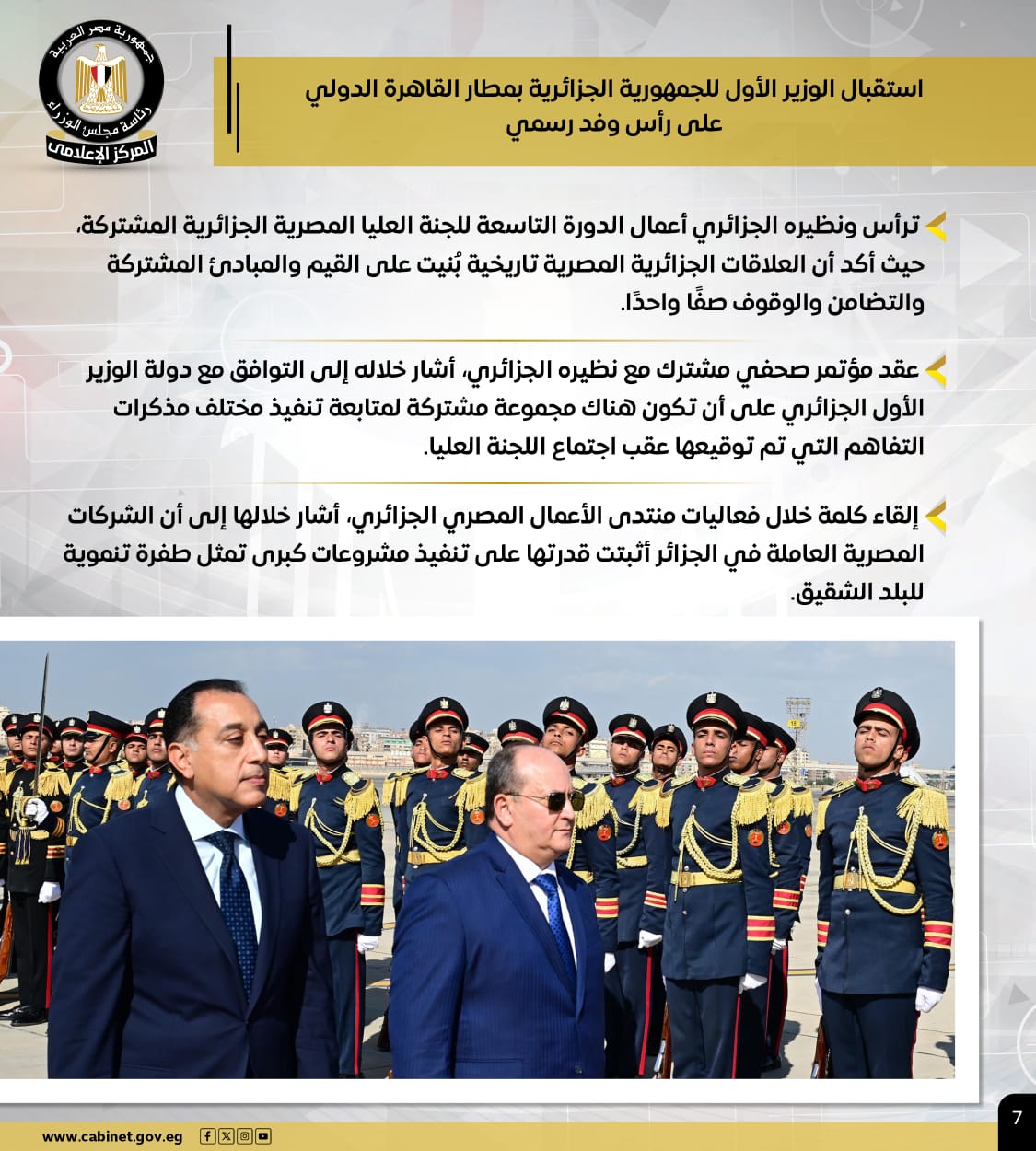 وعلى صعيد العلاقات الثنائية، استقبل رئيس الوزراء نظيره الجزائري بمطار القاهرة الدولي، وترأسا أعمال الدورة التاسعة للجنة العليا المصرية الجزائرية المشتركة، مؤكدين على عمق العلاقات التاريخية والقيم والمبادئ المشتركة. وتم الاتفاق على تشكيل مجموعة مشتركة لمتابعة تنفيذ مذكرات التفاهم، كما ألقى الدكتور مدبولي كلمة في منتدى الأعمال المصري الجزائري، أبرز فيها قدرة الشركات المصرية على تنفيذ مشروعات تنموية كبرى بالجزائر الشقيقة.