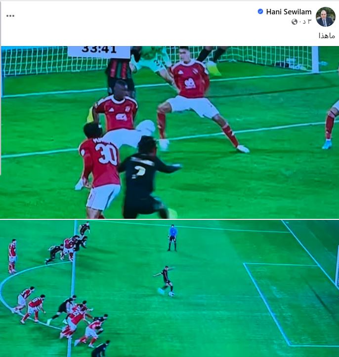 علق الدكتور هاني سويلم وزير الموارد المائية والري، عبر صفحته على موقع فيس بوك، على ضربة الجزاء المحتسبة ضد فريق النادي الأهلي في مباراته أمام فريق الجيش الملكي المغربي، والتي تجرى أحداثها الآن على ملعب مولاي الحسن، ضمن منافسات الجولة الثانية من دور المجموعات لبطولة دوري أبطال إفريقيا.