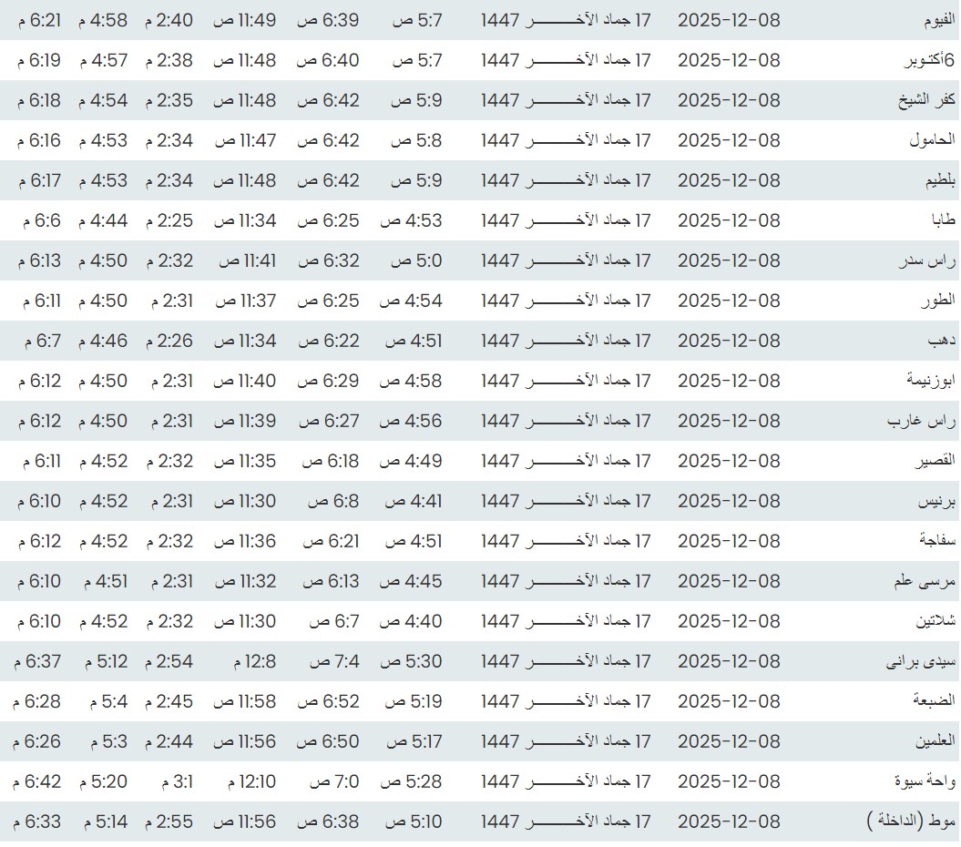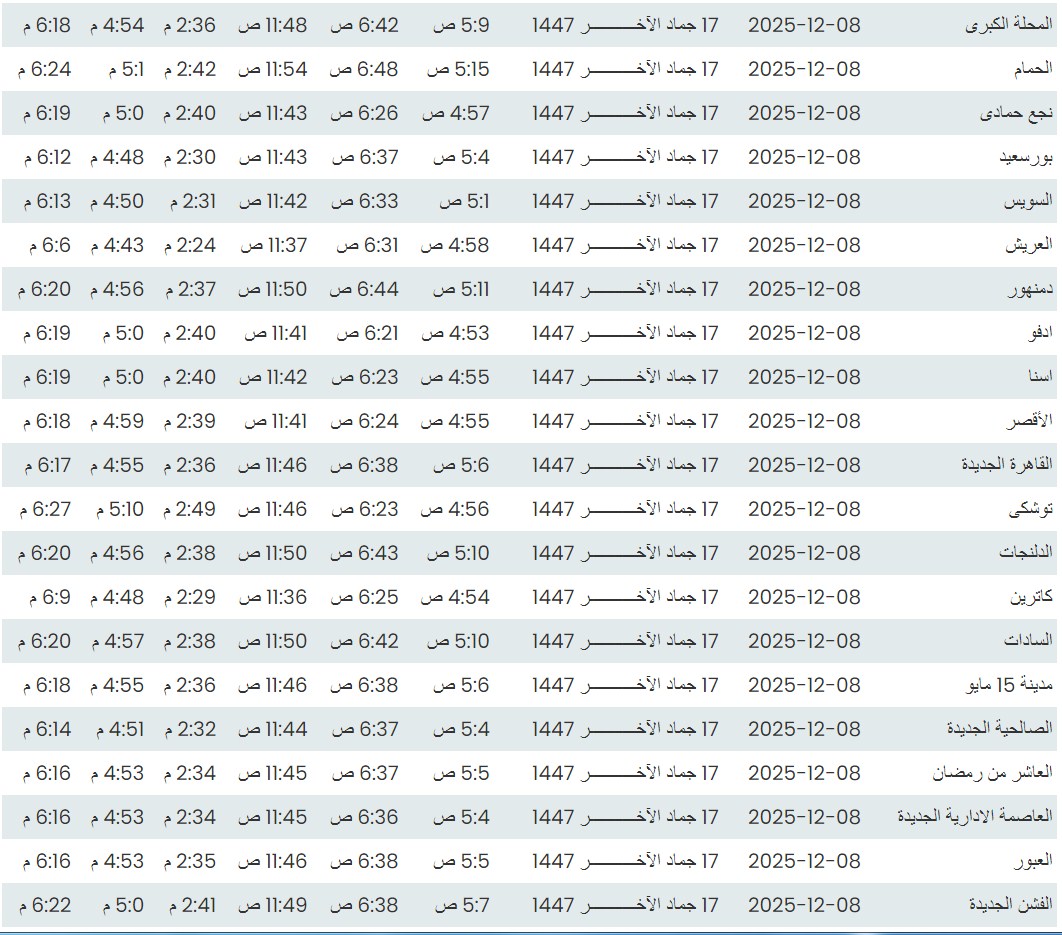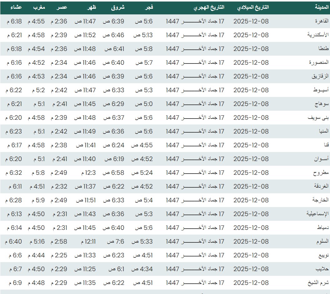 وفيما يلي مواقيت الصلاة، لعدد من مدن ومحافظات الجمهورية من واقع بيانات الهيئة العامة للمساحة