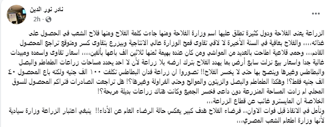 وتابع نادر نور الدين سرد أزمة الفلاح المصري، فقال: "الفلاح بعافية في السنة الأخيرة لا لاقي تقاوى قمح الوزارة عالي الإنتاجية، وبيزرع بتقاوى كسر، ومتوقع تراجع المحصول القادم، وحمى قلاعية أطاحت بالعديد من المواشي، ومن كان عنده بهيمة ثمنها ثلاثين ألف باعها بألفين، أسعار تقاوى وأسمده ومبيدات غالية جدًا وأسعار بيع نزلت سابع أرض بما يهدد الفلاح بترك أرضه بلا زراعة، لأن لا أحد يحدد مساحات زراعات الطماطم والبصل والبطاطس وغيرها وينصح بها حتى لا يخسر الفلاح!!".