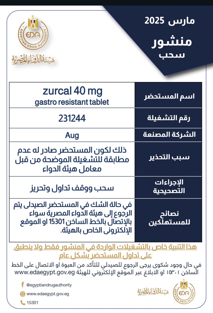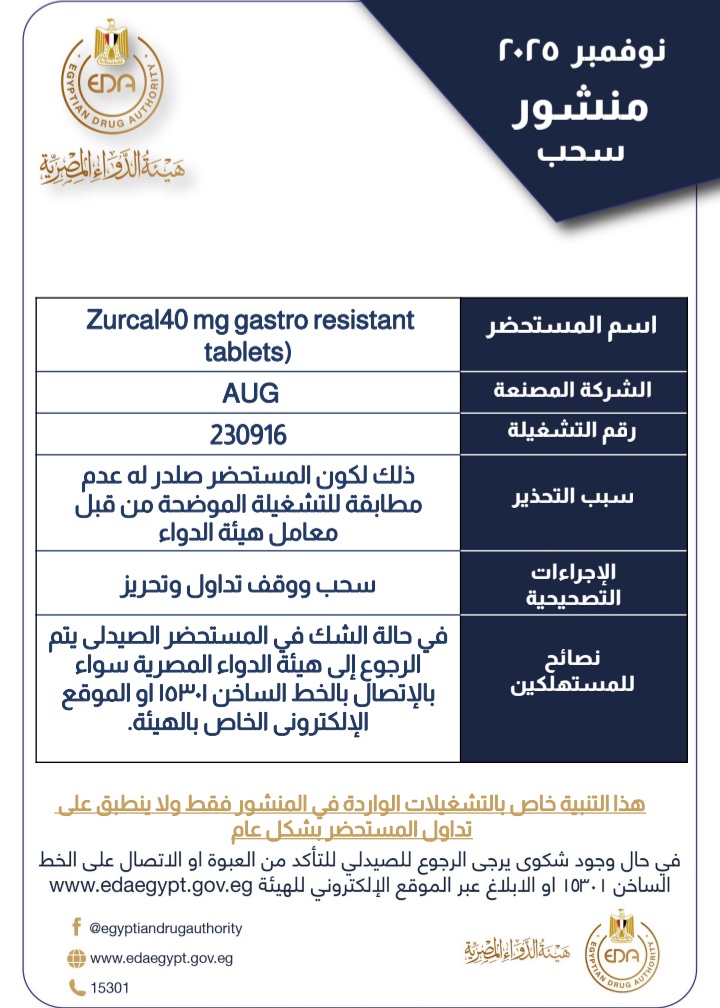 أصدرت هيئة الدواء المصرية منشورًا رسميًا يفيد بسحب تشغيلــة محددة من المستحضر الدوائي Zurcal 40 mg gastro resistant tablets وتحمل رقم التشغيلــة 230916، وذلك بعد ثبوت عدم مطابقتها للمواصفات القياسية المُعتمدة بمعامل الهيئة.