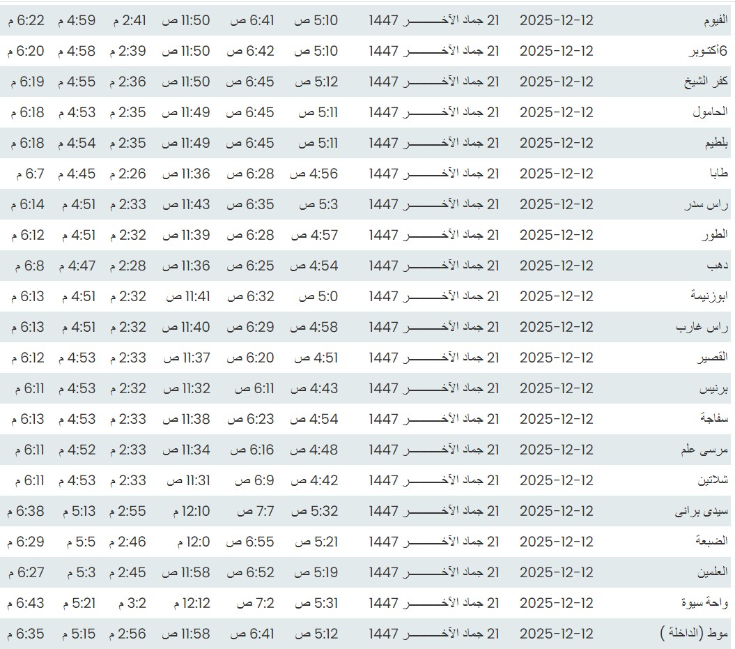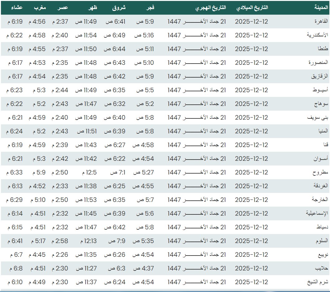 مواقيت الصلاة اليوم وفقًا للتوقيت المحلي لمدينتي القاهرة والإسكندرية وكذلك لعدد من مدن ومحافظات الجمهورية من واقع بيانات الهيئة العامة للمساحة: