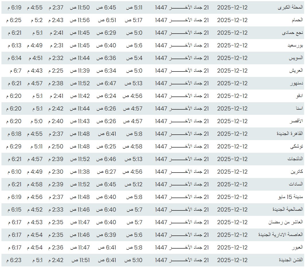 مواقيت الصلاة اليوم الجمعة 12 - 12 - 2025 في القاهرة والمحافظات
