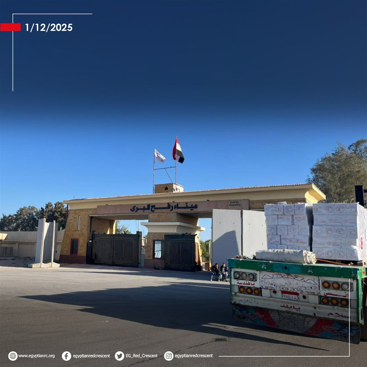 ويتواجد الهلال الأحمر المصري كآلية وطنية لتنسيق وتفويج المساعدات إلى غزة، على الحدود منذ بدء الأزمة حيث لم يتم غلق معبر رفح من الجانب المصري نهائيًا، وواصل تأهبه فى كافة المراكز اللوجستية وجهوده المتواصلة لدخول المساعدات التي بلغت أكثر من نصف مليون طن من المساعدات الإنسانية والإغاثة، وذلك بجهود 35 ألف متطوع بالجمعية.