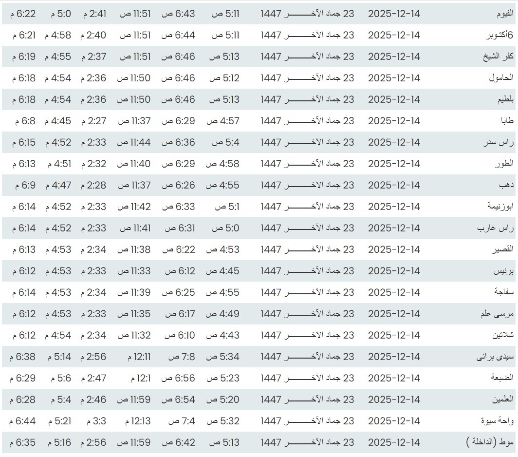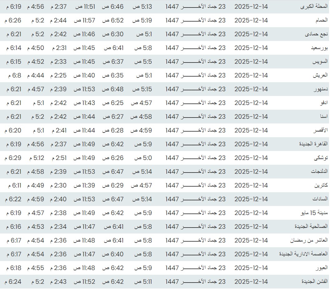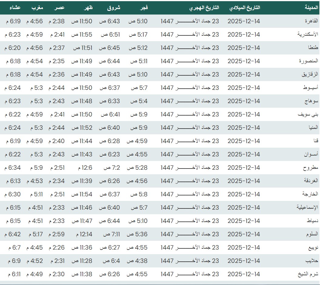 وفيما يلي مواقيت الصلاة، لعدد من مدن ومحافظات الجمهورية من واقع بيانات الهيئة العامة للمساحة