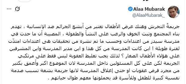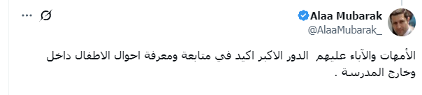 وقال علاء مبارك في رسالته التي وجهها للأباء بشأن جرائم التحرش في المدارس: "الأمهات والآباء عليهم الدور الأكبر، أكيد في متابعة ومعرفة أحوال الأطفال داخل وخارج المدرسة".