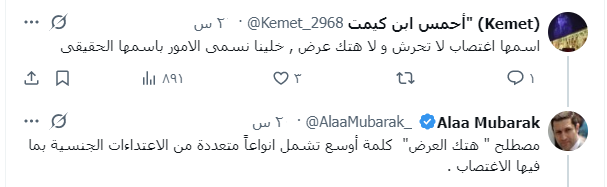 فرد علاء مبارك قائلًا: "مصطلح "هتك العرض" كلمة أوسع تشمل أنواعًا متعددة من الاعتداءات الجنسية بما فيها الاغتصاب".