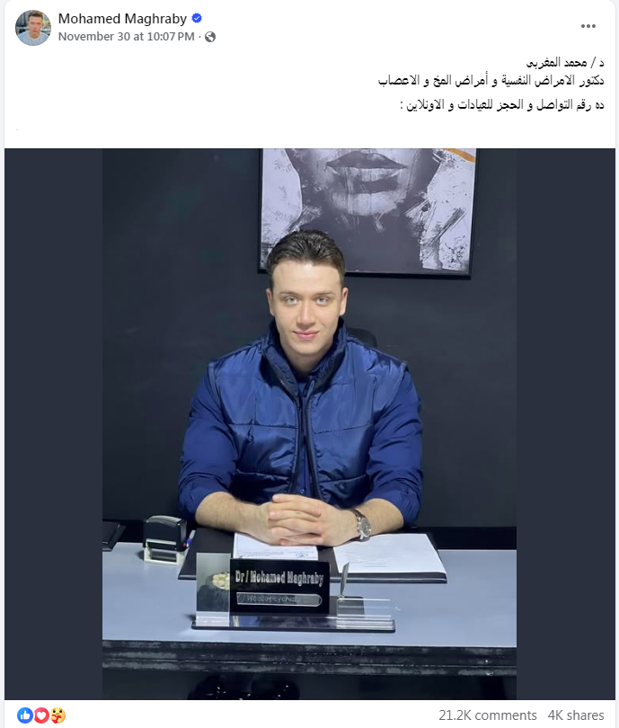 بداية حكاية طبيب الأمراض النفسية المثيرة للجدل، بدأت عندما نشر الدكتور محمد المغربى دكتور الأمراض النفسية وأمراض المخ والأعصاب، إعلانا عن بدء العمل في عيادته الخاصة، ونشر مع الإعلان صورته الشخصية، لتنهال عليه التعليقات التي بلغت أكثر من 21 ألف تعليق، معظمها من السيدات والفتيات.