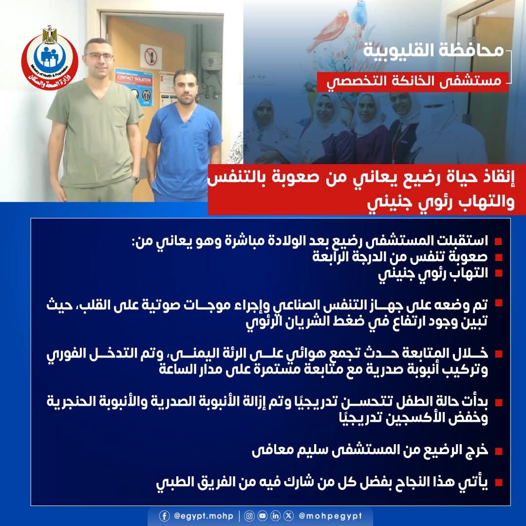 فيما أعلنت وزارة الصحة والسكان أن الفريق الطبي بمستشفى الخانكة التخصصي بمحافظة القليوبية نجح في إنقاذ حياة رضيع وُلد حديثًا، بعدما استقبلته المستشفى وهو يعاني من صعوبة شديدة في التنفس من الدرجة الرابعة والتهاب رئوي جنيني.