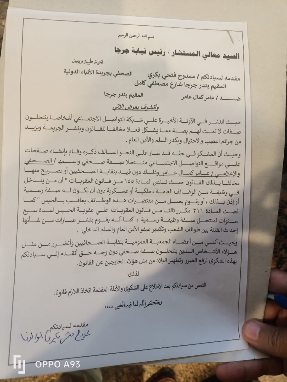 وأكد القعيد في محضره أن المتهم بيقدم نفسه في دائرة مركز وقرى جرجا بصفته صحفيا ويمارس نشاطا إعلاميا دون أن يمتلك أي مستند رسمي يثبت أحقيته في ممارسة المهنة وأن الشخص لا تربطه أي صلة بنقابة الصحفيين وليس مقيدا بجداولها ولا يمتلك خطابا أوتصريحا صادرا عنها يسمح له بالعمل في المجال الصحفي مما يجعله منتحلا للصفة ويعرضه للمساءلة القانونية وأن استمرار مثل هذه الممارسات يضر بسمعة المهنة ويؤثر على عمل الصحفيين الحقيقيين الذين يلتزمون بالقانون والمعايير المهنية.
