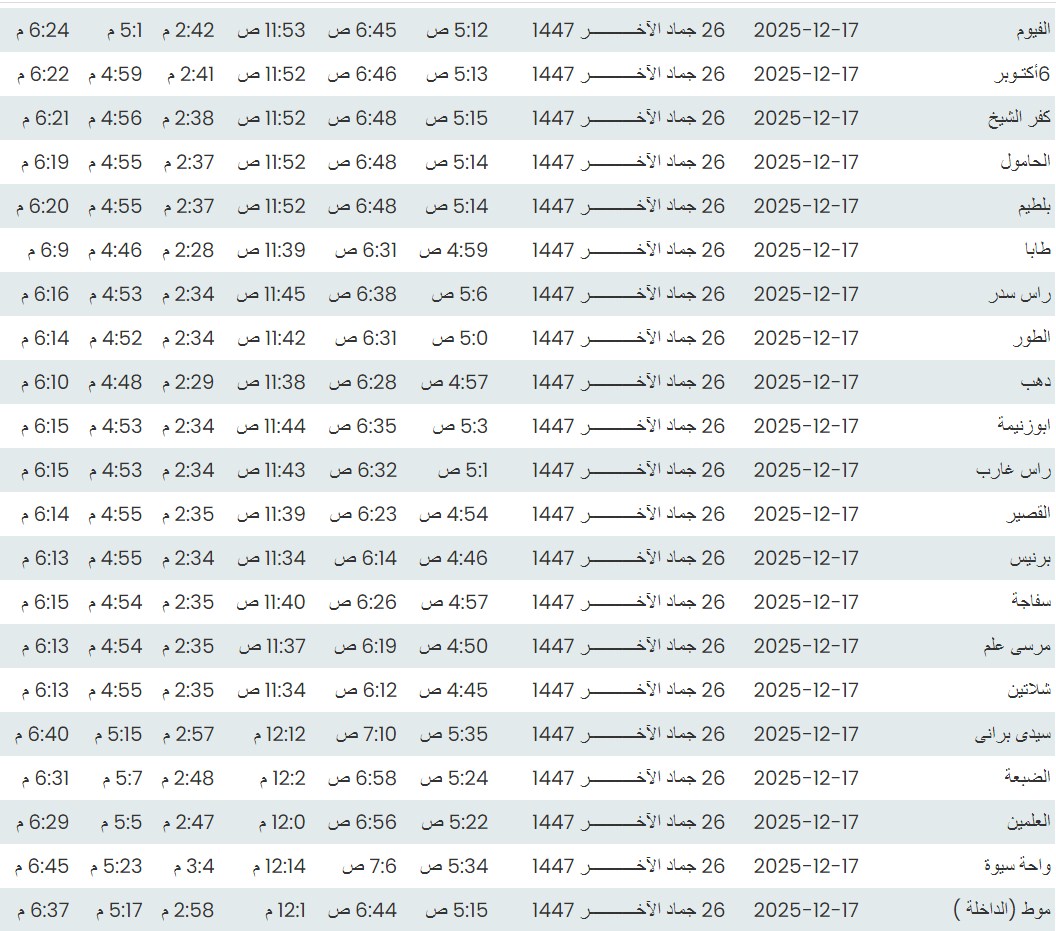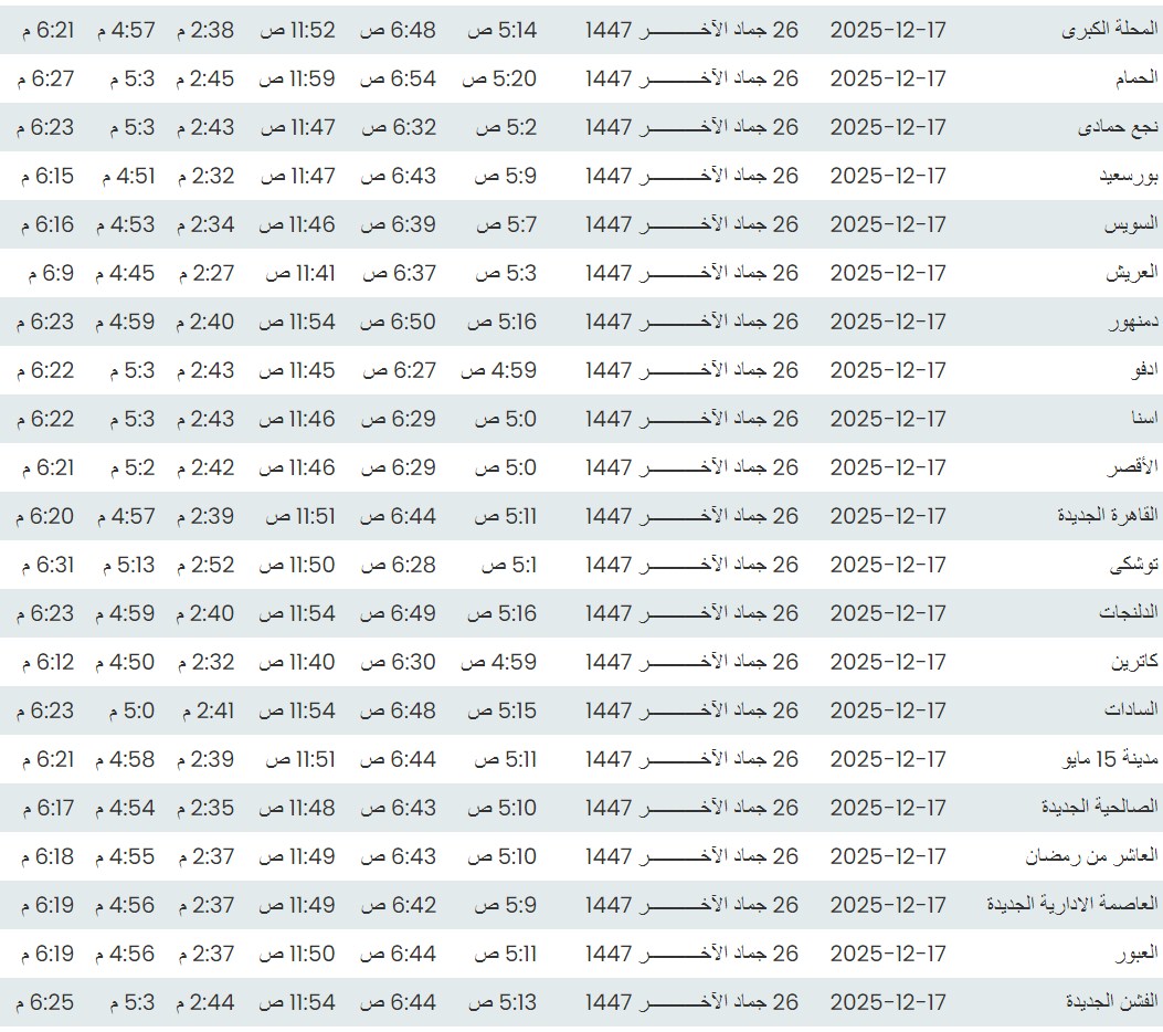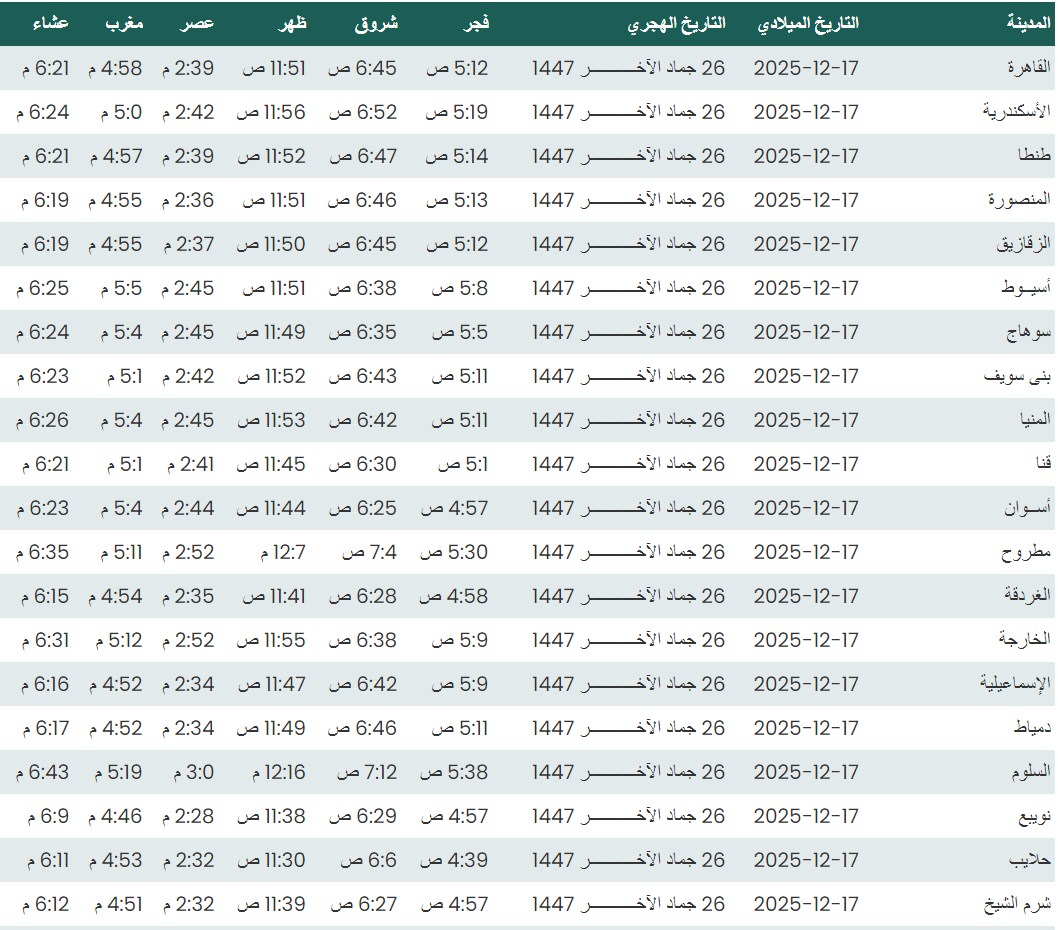 وفيما يلي مواقيت الصلاة، لعدد من مدن ومحافظات الجمهورية من واقع بيانات الهيئة العامة للمساحة